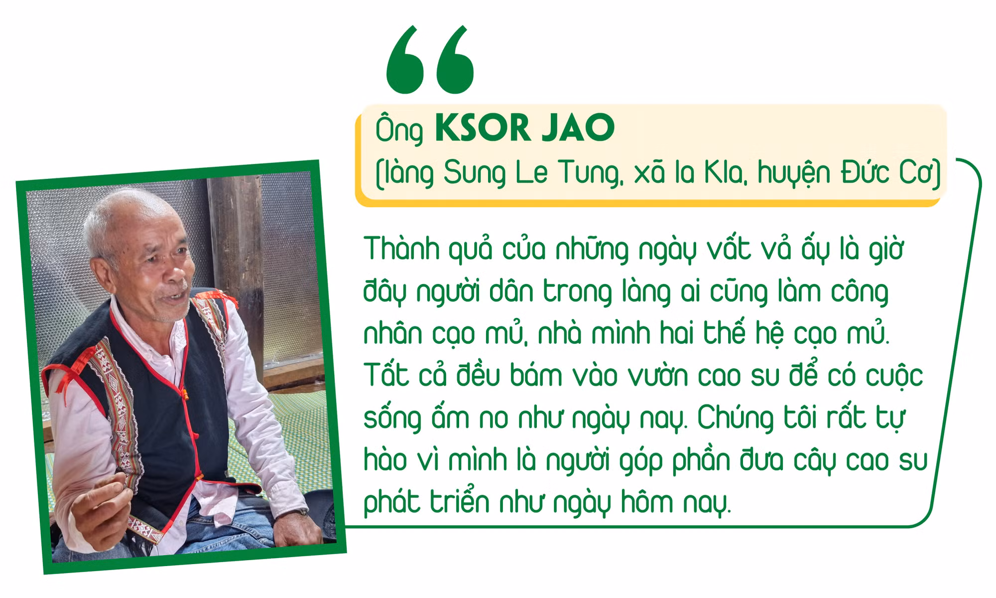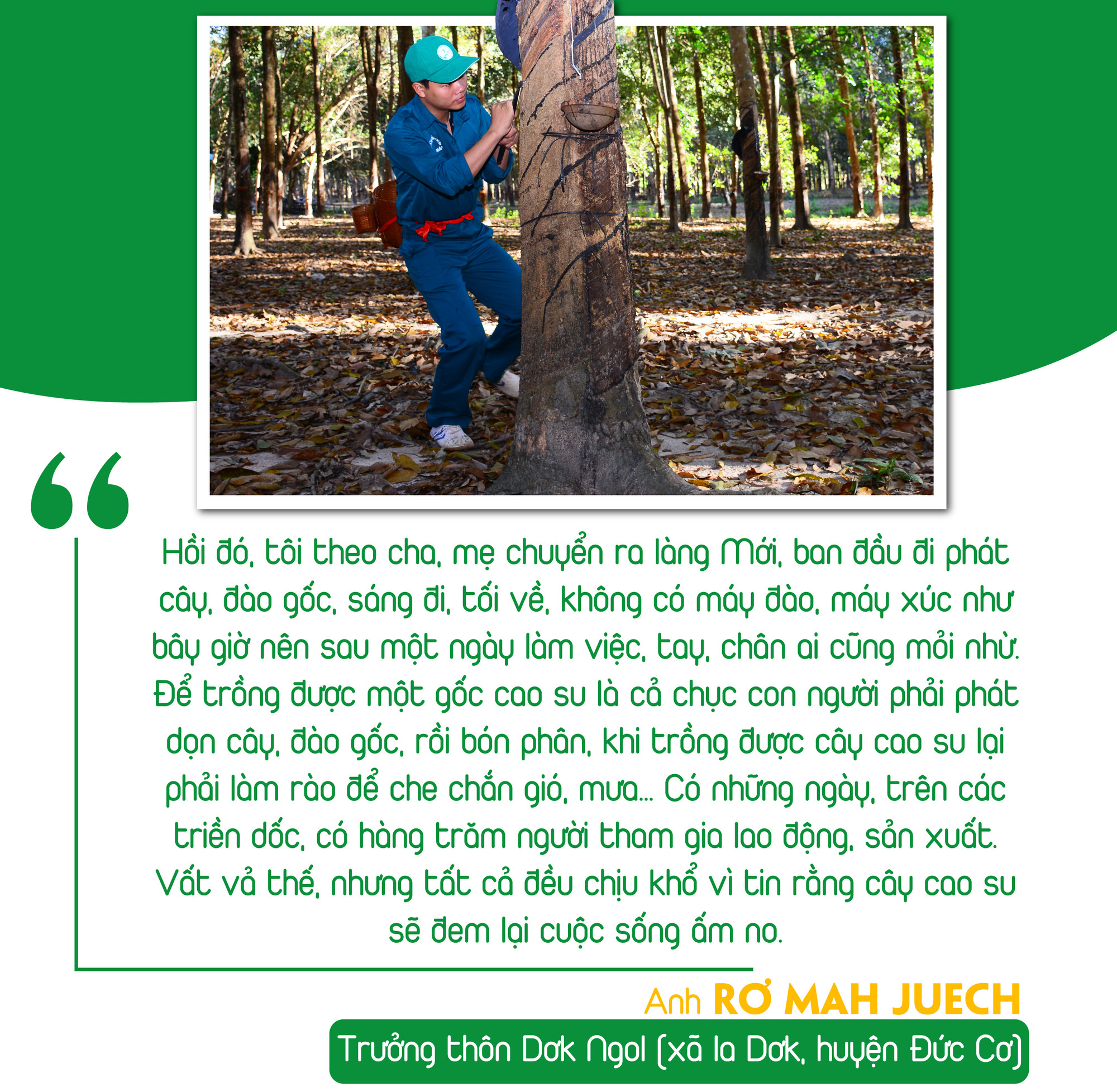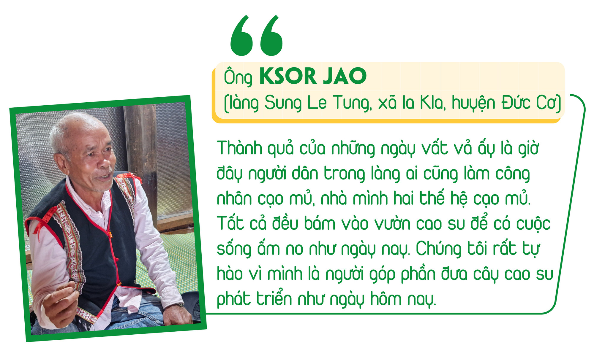 Căn nhà của ông Ksor Jao nằm ven con đường liên huyện Đức Cơ-Ia Grai (làng Sung Le Tung, xã Ia Kla, huyện Đức Cơ). Năm nay vừa bước qua hơn 60 mùa rẫy, nhưng ký ức về những năm tháng khai sơn, phá thạch cùng các công ty của Binh đoàn 15 vẫn còn in đậm trong tâm trí, ký ước những ngày nằm lán, ngủ rừng để khai hoang: "Nói làm sao hết những khó khăn gian khổ những ngày ấy. Năm 1985, Binh đoàn đã vận động người dân địa phương như chúng tôi tham gia. Bấy giờ, nơi đây như một đại công trường với hàng ngàn con người. Thiếu máy móc, tất cả chỉ lao động thủ công dùng cuốc, rìu, dao và xẻng để chặt cây, dọn gốc, đào hố. Gian khổ lắm, nhưng ai cũng tin tưởng cao su sẽ cho người dân có cuộc sống ấm no nên tất cả đều cố gắng". Đưa mắt nhìn về cánh rừng cao su trập trùng, già Jao thêm tự hào: