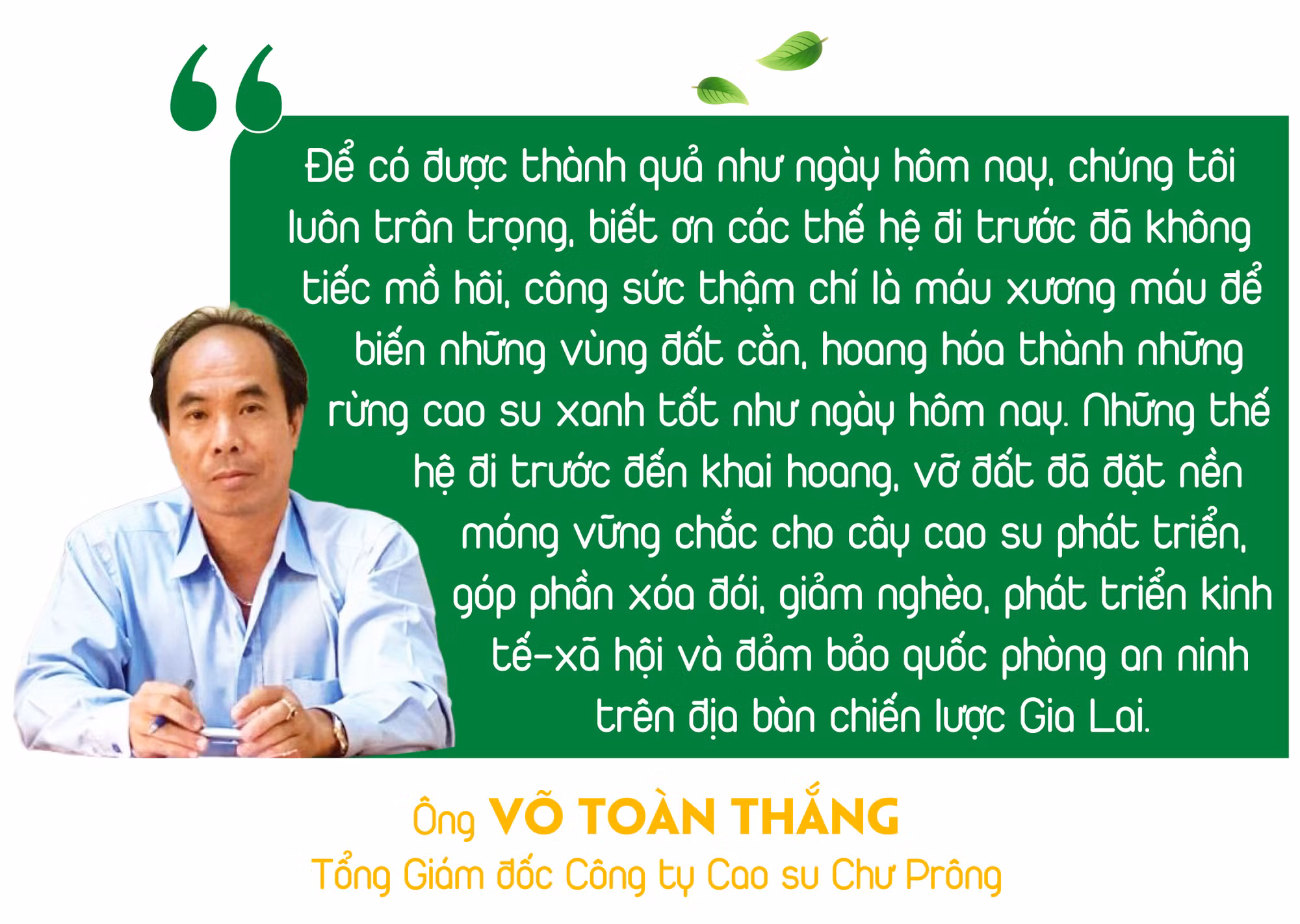 Nhớ về những ngày vào Gia Lai khai hoang trồng cao su, ông Nguyễn Văn Thành (thôn Hợp Thắng, xã Ia Drăng, huyện Chư Prông) tâm sự: Ngày ấy, thực hiện lời kêu gọi của Đảng, Nhà nước, chúng tôi những thanh niên tuổi mười tám, đôi mươi, tạm biệt quê hương lên đường vào Gia Lai lập khu kinh tế mới. Kể làm sao hết những khó khăn, gian khổ thời ấy, sốt rét, thú dữ, chất độc hóa học…thiếu thốn trăm bề, đôi lúc tưởng chừng như bỏ cuộc. Thế nhưng, bằng sức trẻ, nghị lực khai phá vùng đất Tây Nguyên, chúng tôi đã vượt qua tất cả và thành quả hôm nay là những vườn cao su xa tít tầm mắt, mang lại cuộc sống ấm no cho người dân.