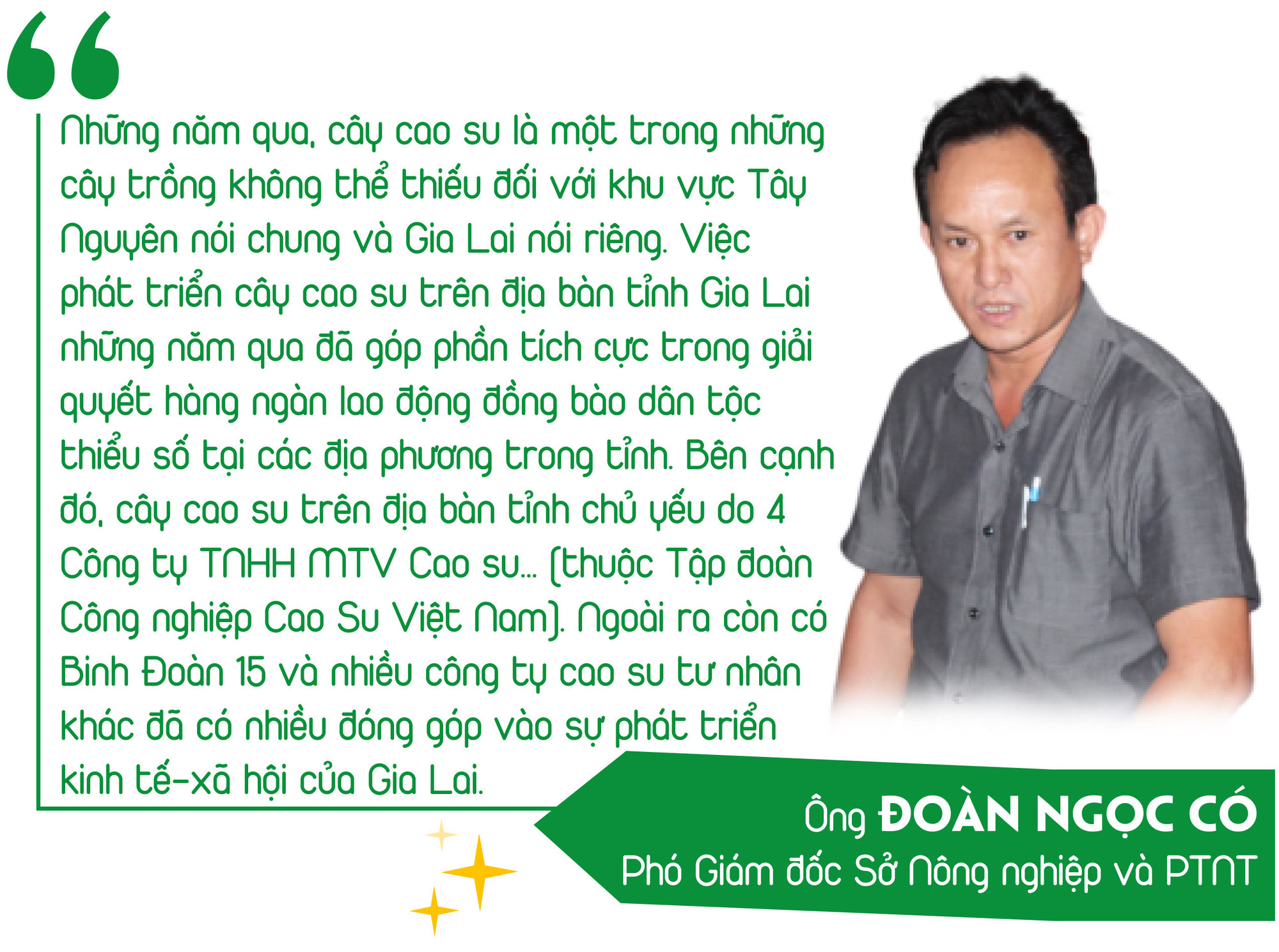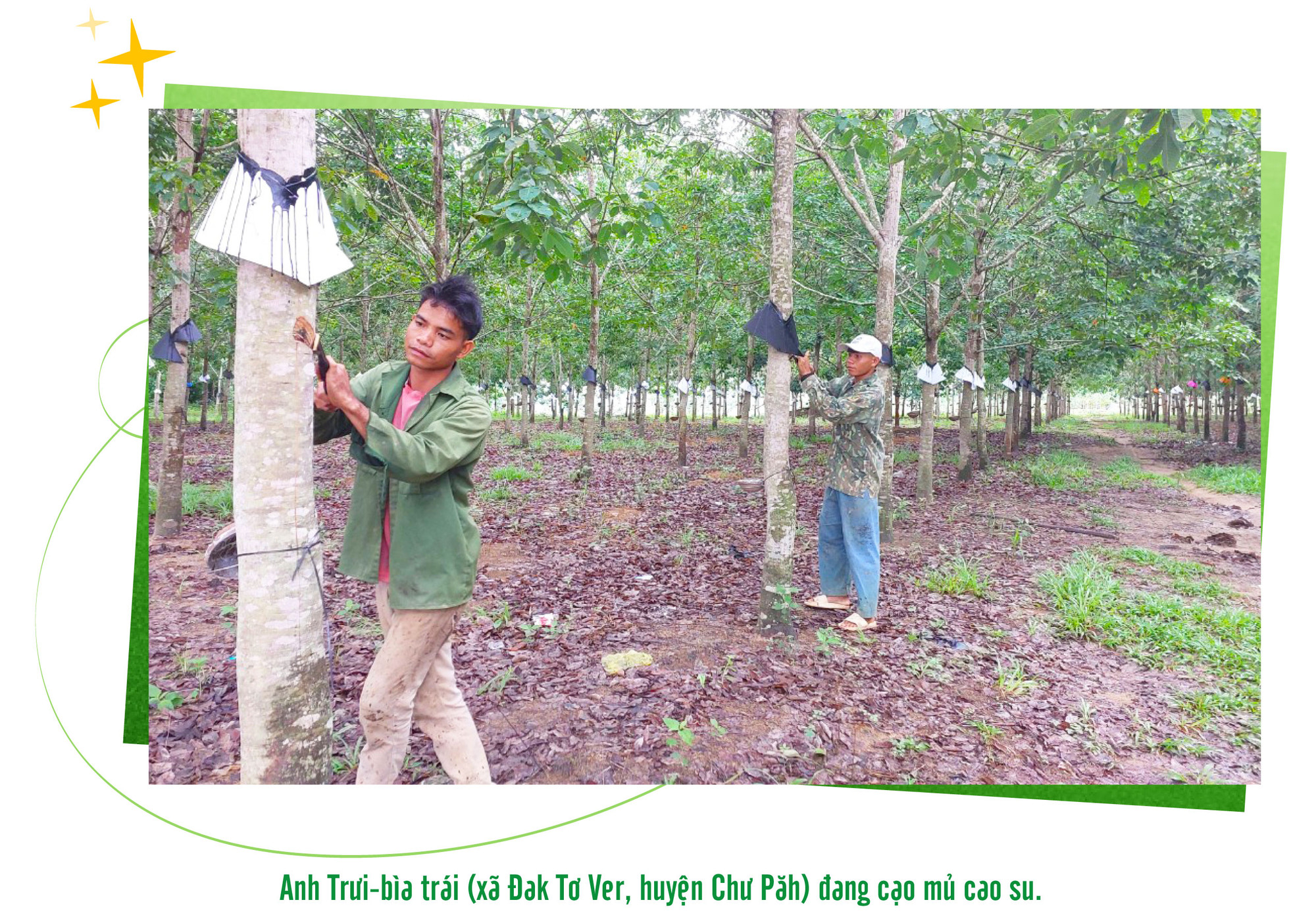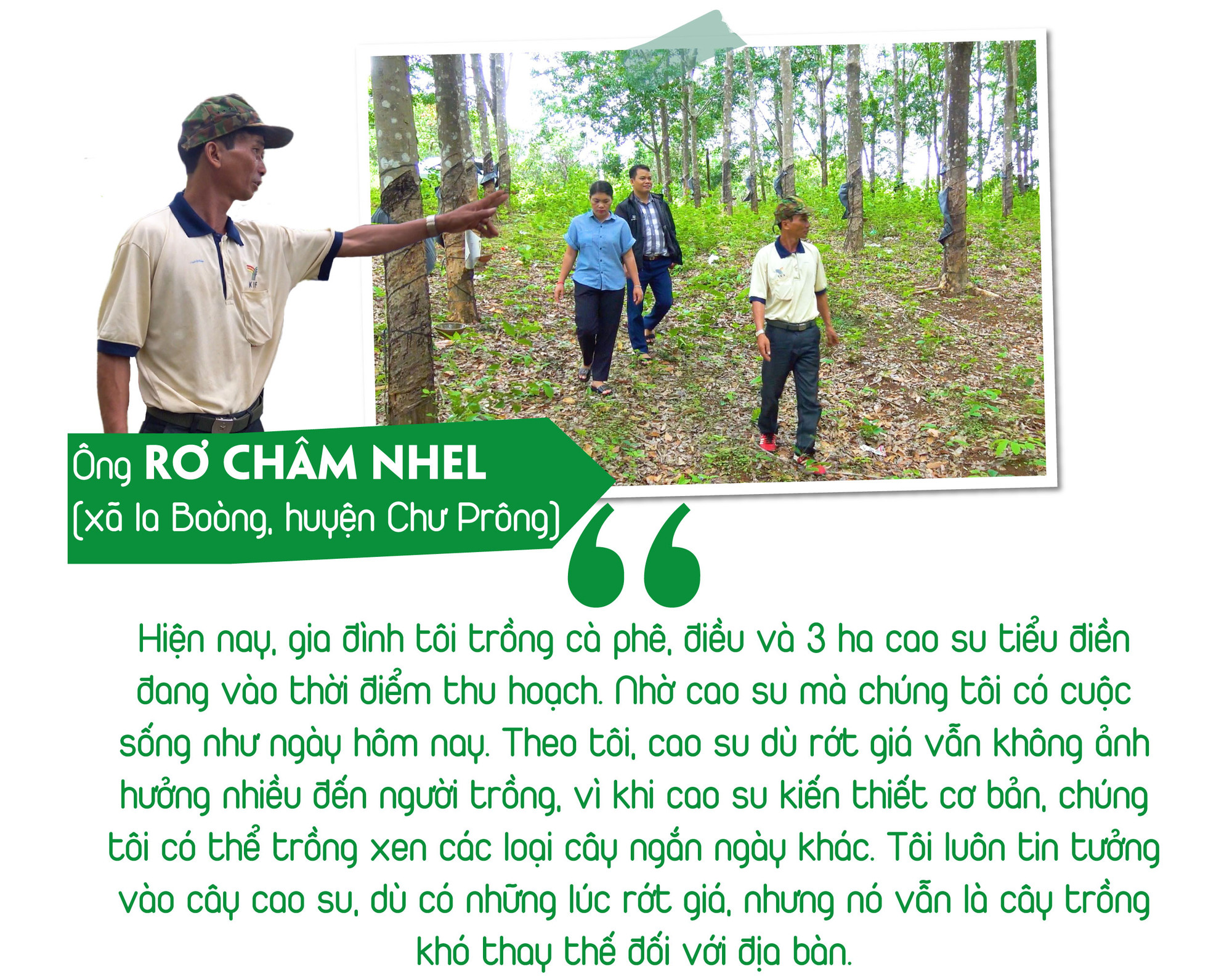 Nếu bạn một lần đi qua nhiều vùng đất Bắc Tây Nguyên, từ Sa Thầy, Đak Tô rồi về biên giới Đức Cơ, Ia Grai, Chư Prông hay ghé Mang Yang, Chư Păh… ở đâu cũng sẽ bắt gặp một màu xanh bạt ngàn của cao su. Điều dễ nhận thấy nhất là ở đâu có rừng cao su thì ở đó có dân cư và có cuộc sống ấm no, hạnh phúc. Dù có những giai đoạn giá mủ cao su giảm thấp, những người thợ cạo vẫn bám vườn cây, bám nông trường, đội sản xuất và nhiều người dân trồng cao su tiểu điền vẫn cần mẫn chăm sóc vườn cây. Bởi hơn ai hết, họ hiểu được giá trị của cây cao su mang lại cuộc sống ấm no và hạnh phúc như hôm nay.