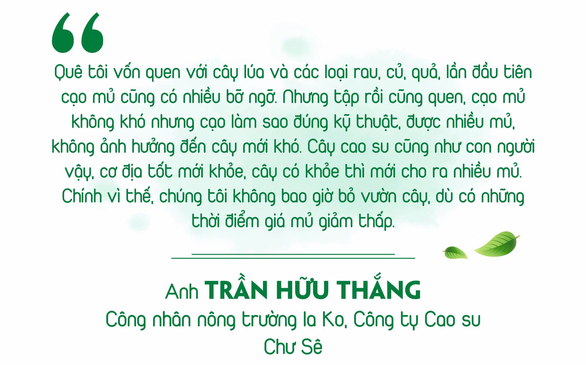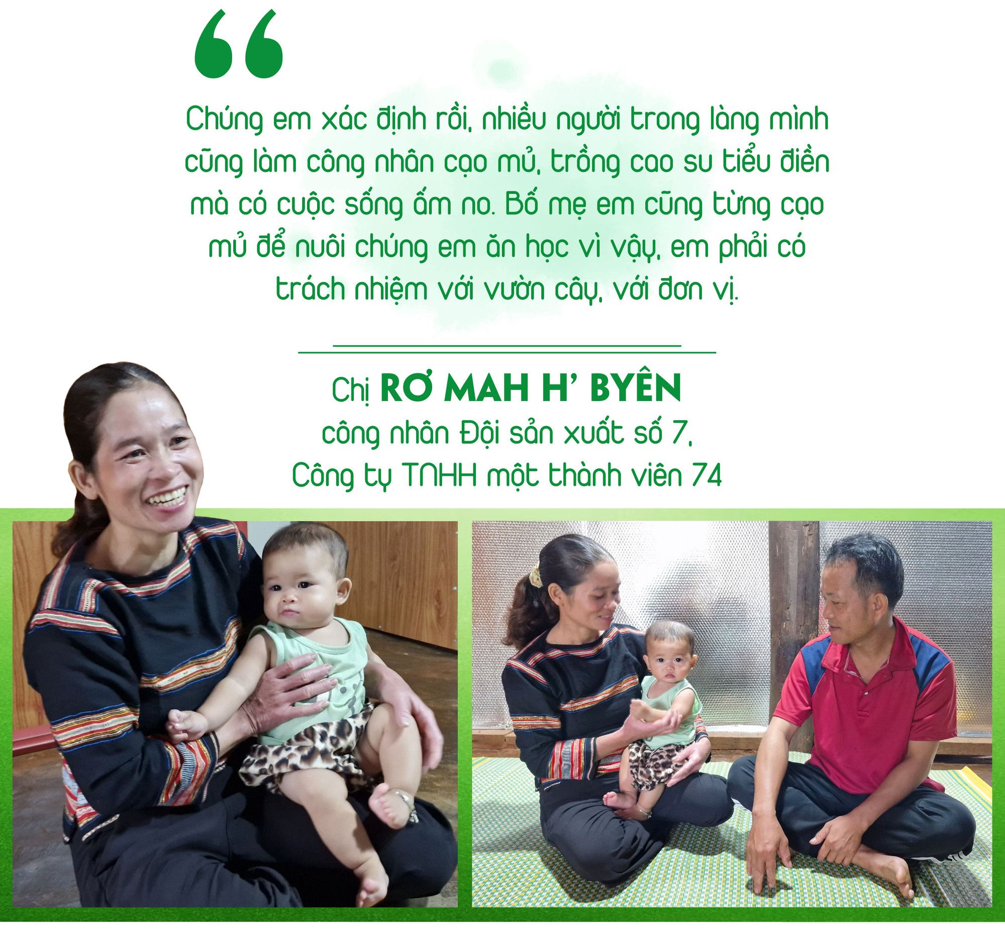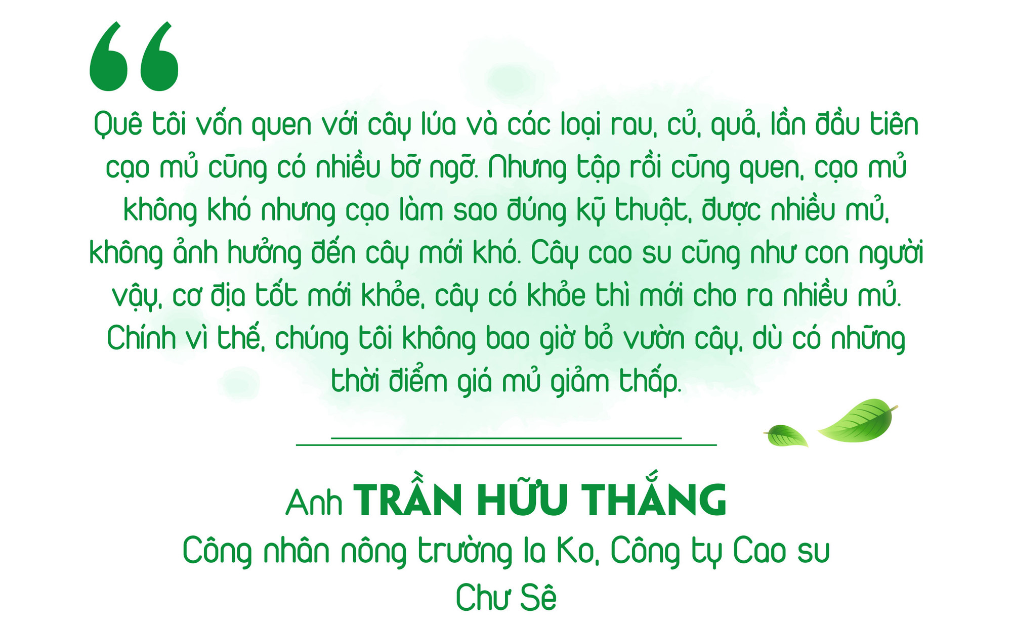 Để có những vườn cao su xanh tốt, cho dòng nhựa trắng thì vai trò của những người công nhân có yếu tố quyết định, họ là những người dù trải qua những thăng trầm khi giá mủ cao su giảm sâu nhưng vẫn gắn bó với vườn cây, coi đó như tài sản của gia đình để chăm sóc.