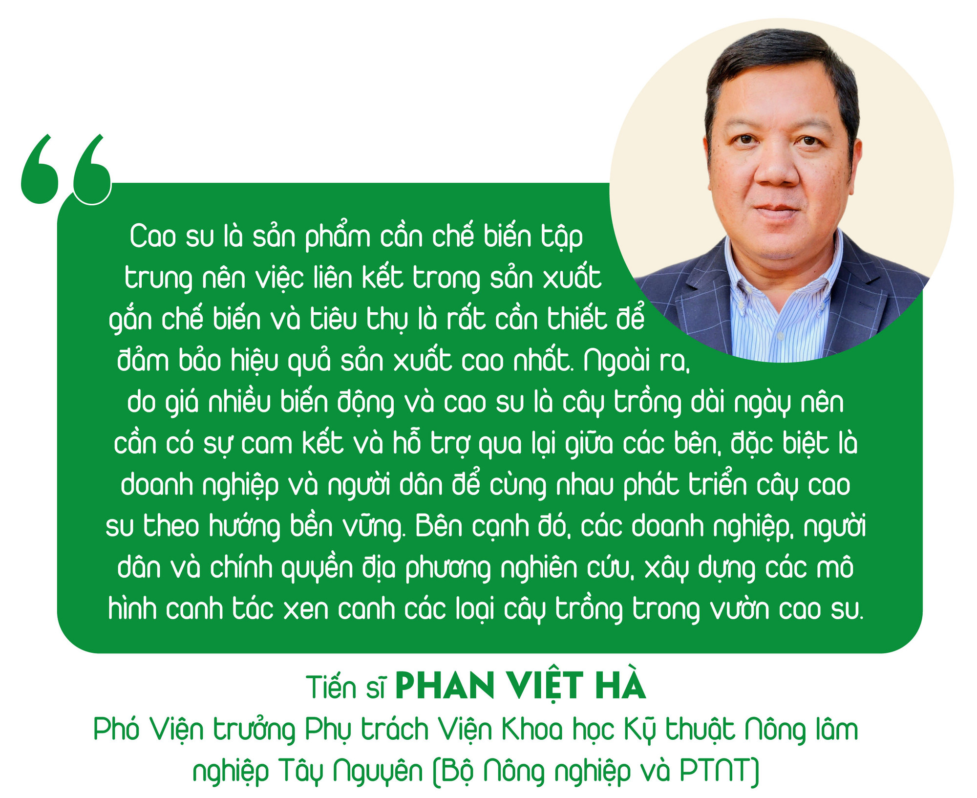 Tiến sĩ Phan Việt Hà-Phó Viện trưởng Phụ trách Viện Khoa học Kỹ thuật Nông lâm nghiệp Tây Nguyên (Bộ Nông nghiệp và PTNT)-cho biết: Với kim ngạch xuất khẩu hàng năm của cây cao su dao động khoảng gần 3 tỷ USD, cao su được xem là một trong những cây trồng chủ lực trong Chiến lược phát triển trồng trọt đến năm 2030 và tầm nhìn đến năm 2050 của Việt Nam và các tỉnh Tây Nguyên. Theo thống kê của Tập đoàn Công nghiệp Cao su Việt Nam, hiện nay năng suất trung bình của cao su Việt Nam khoảng 1,6 tấn/ha, với giá xuất khẩu trung bình năm 2023 là 1.300 USD/tấn thì một ha có thể mang lại thu nhập xấp xỉ 2 ngàn USD, so với các cây trồng chủ lực khác ở Tây Nguyên như cà phê, hồ tiêu thì thu nhập người dân trồng cao su thấp, tuy nhiên chi phí đầu tư cho cây cao su không cao bằng các loại cây trồng khác. Ngoài ra, cây cao su được xem là cây trồng đa mục đích nên diện tích cao su còn được xem là diện tích rừng và có tiềm năng rất lớn trong thu nhập lâu dài như thu hoạch gỗ cuối chu kỳ khai thác hay có thể tạo thu nhập từ tín chỉ carbon trong tương lai.