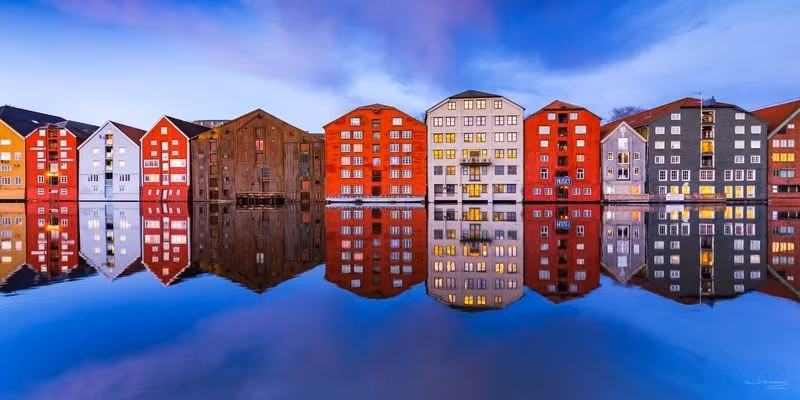 Soi bóng. Tác giả đã chụp được bức ảnh dãy nhà soi bóng xuống dòng sông quê hương của mình tại Trondheim, Na Uy.
