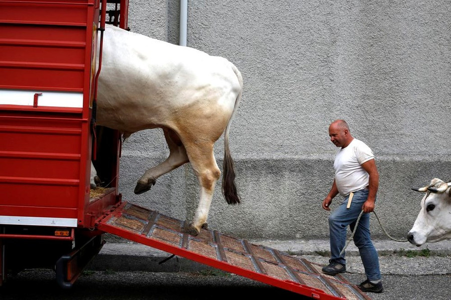 Một nông dân đưa những con bò lên xe tải để tham gia lễ hội San Rocco ở thị trấn Montanesi, Italy.