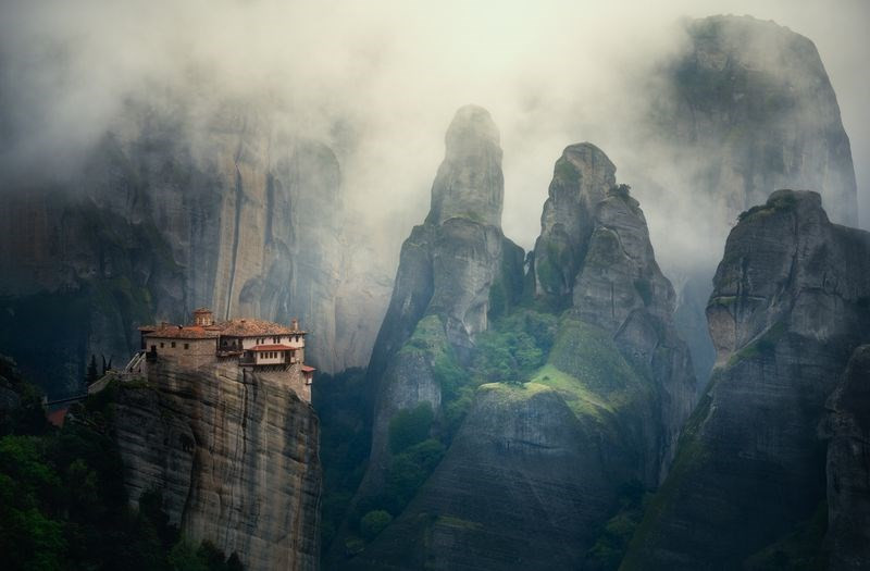 Tu viện Roussanou nằm trong quần thể tu viện Meteora với kiến trúc độc đáo, nằm lơ lửng trên không ở Hy Lạp.