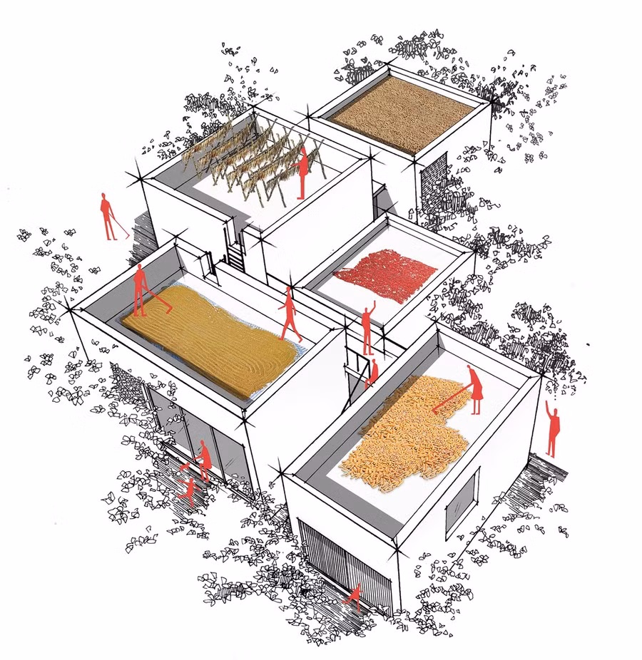 Cấu tạo phần mái được chia làm hai lớp giúp cho đảm bảo cách nhiệt và thuận tiện việc phơi nông sản. Nước mưa trên mái sẽ được thu toàn bộ vào bể ngầm được đặt ở bên dưới để phục vụ cho việc sinh hoạt, chăm sóc cây trồng, tái sinh nguồn nước