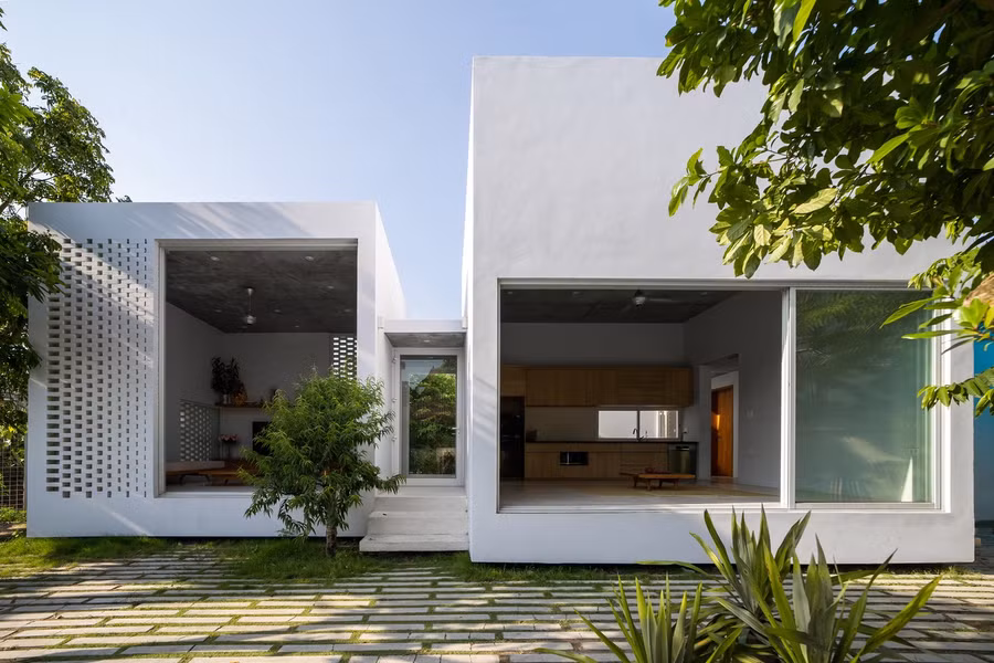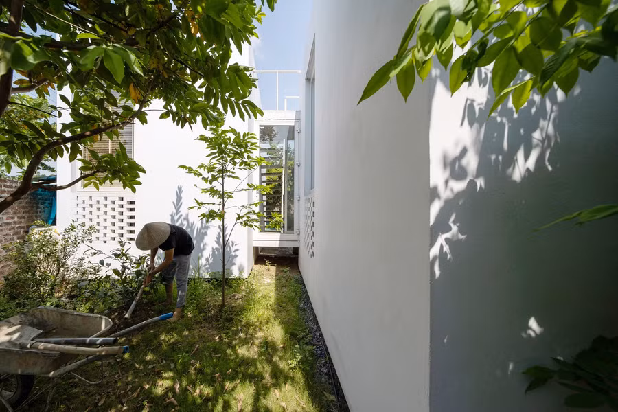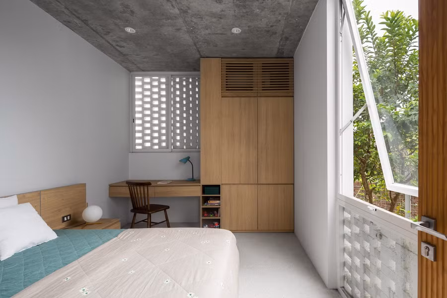 Các mảng tường gạch đặc rỗng giúp tạo sự riêng tư nhất định cho ngôi nhà, cũng như hạn chế việc nắng chiếu trực tiếp vào không gian bên trong.