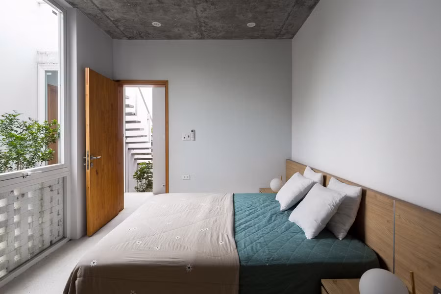 Không gian phòng ngủ sử dụng nội thất màu nâu gỗ và trắng làm chủ đạo, mang lại cảm giác nhẹ nhàng và đơn giản.
