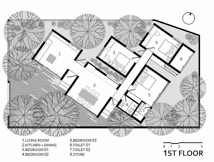 Dự án được thiết kế khá táo bạo khi co cụm khối ở, chừa hai biên khe sáng thông thoáng hai bên và xoay mặt tiền khối nhà về hướng có lợi hơn để thoải mái lấy sáng cho từng ngóc ngách của ngôi nhà.