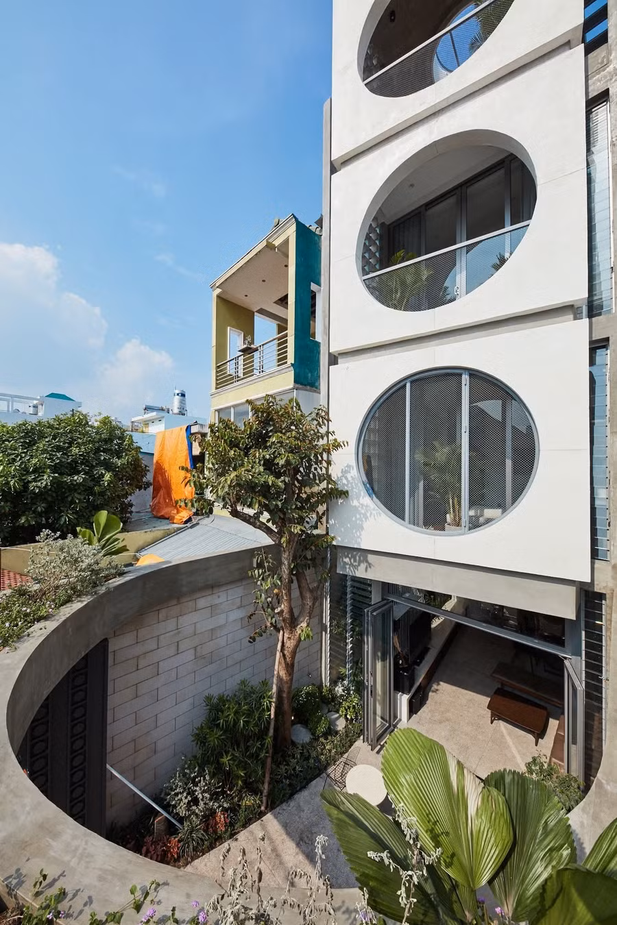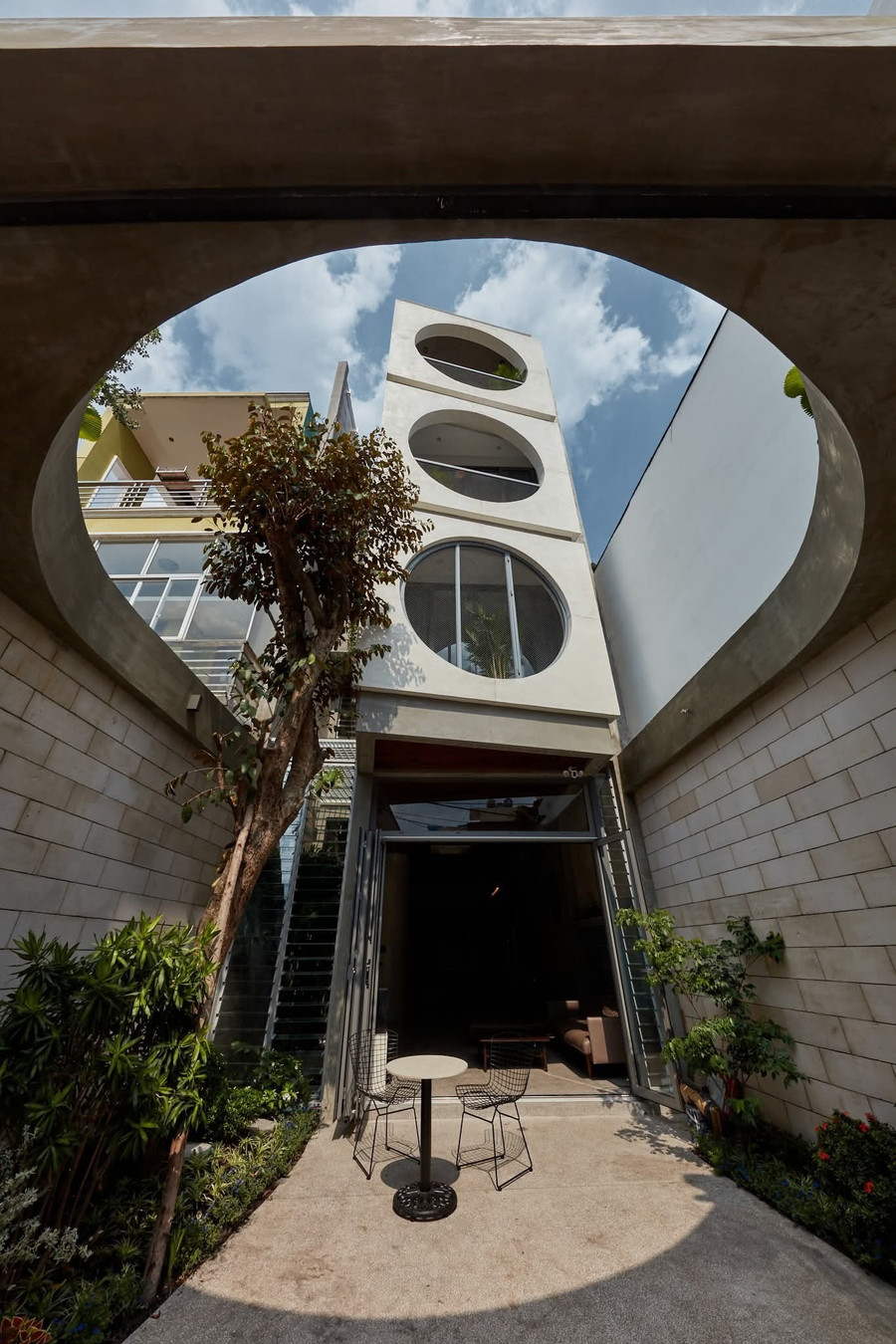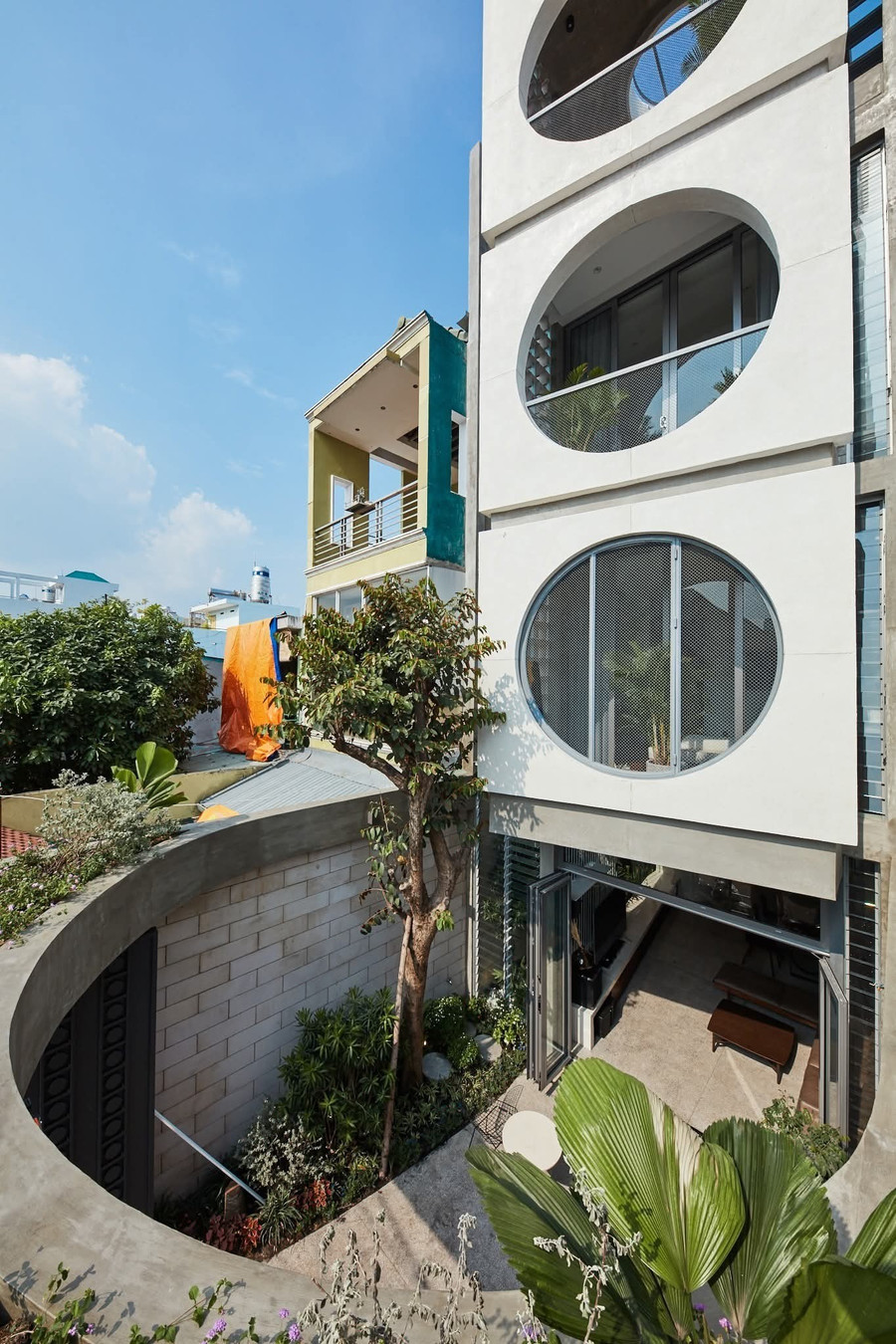 Ngôi nhà được lấy cảm hứng từ đàn guitar, có mặt tiền ấn tượng với các phần khoét hình học chạy dọc khắp mặt tiền, vừa là điểm nhấn vừa là cách lấy sáng và thông khí cho không gian bên trong.