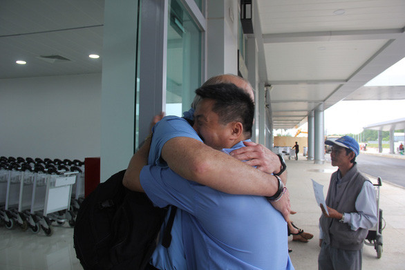 Ông Đức và ông Ronnald ôm chầm lấy nhau tại sân bay Chu Lai (Quảng Nam) lúc hai người về Mỹ Lai dự lễ kỷ niệm 50 năm vụ thảm sát - Ảnh: TRẦN MAI