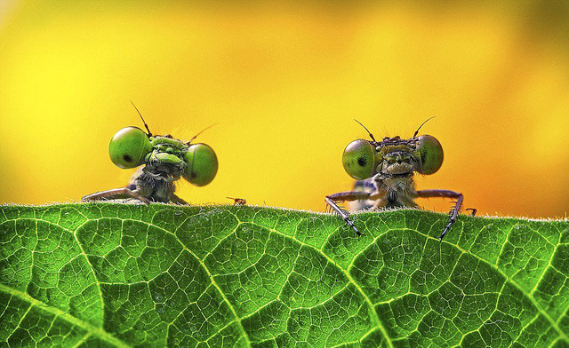 Đôi mắt của hai chú chuồn chuồn kim gây ấn tượng mạnh cho Miao Yong khi cô đang chụp ảnh trong một công viên ở tỉnh Chiết Giang, Trung Quốc. Yong cho biết cô phải mất khá lâu để bắt được "khoảnh khắc vui vẻ" này trong khi những con vật vẫn tiếp tục di chuyển.