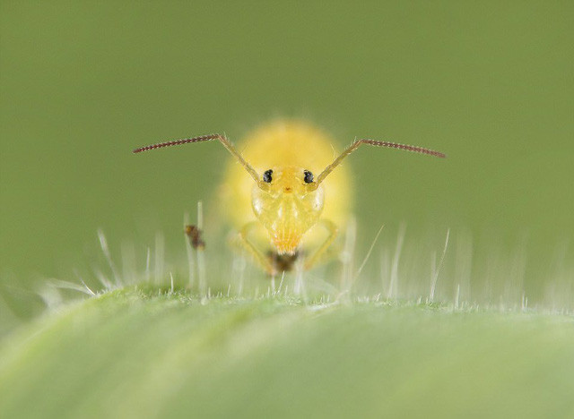 Hình ảnh này nhiếp ảnh gia Marc Brouwer chụp ở Genemuiden, Hà Lan. Đó là một con côn trùng nhỏ khoảng 1 – 2 mm đang bám trên một cọng cỏ.