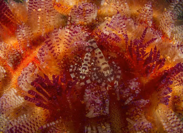 Dheeraj Nanda chụp bức ảnh này khi đang lặn ở Ambon, Indonesia. Hình ảnh dễ gây ảo giác và phải mất khá lâu để người xem phát hiện ra một cặp tôm ẩn giữa con nhím biển lửa – một trong những loài nguy hiểm nhất lòng đại dương.
