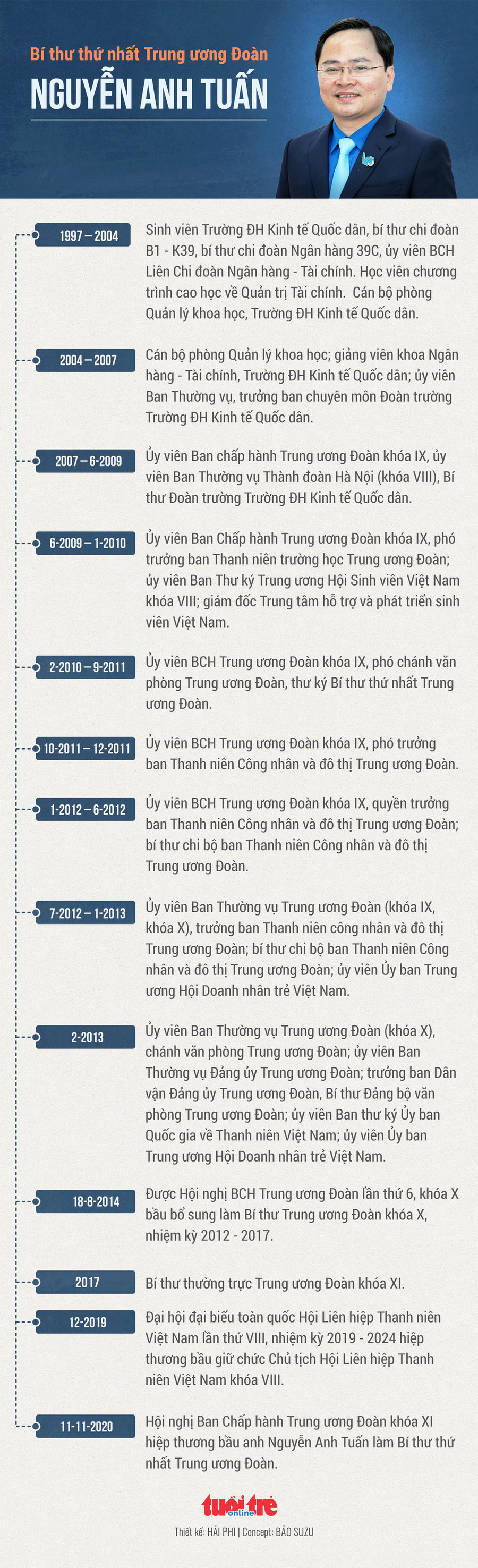 Tân Bí thư thứ nhất Trung ương Đoàn Nguyễn Anh Tuấn, sinh năm 1979, quê quán Thanh Hóa, có trình độ lý luận chính trị cao cấp. Anh tốt nghiệp cử nhân Ngân hàng và thị trường tài chính, tiến sĩ quản lý kinh tế.