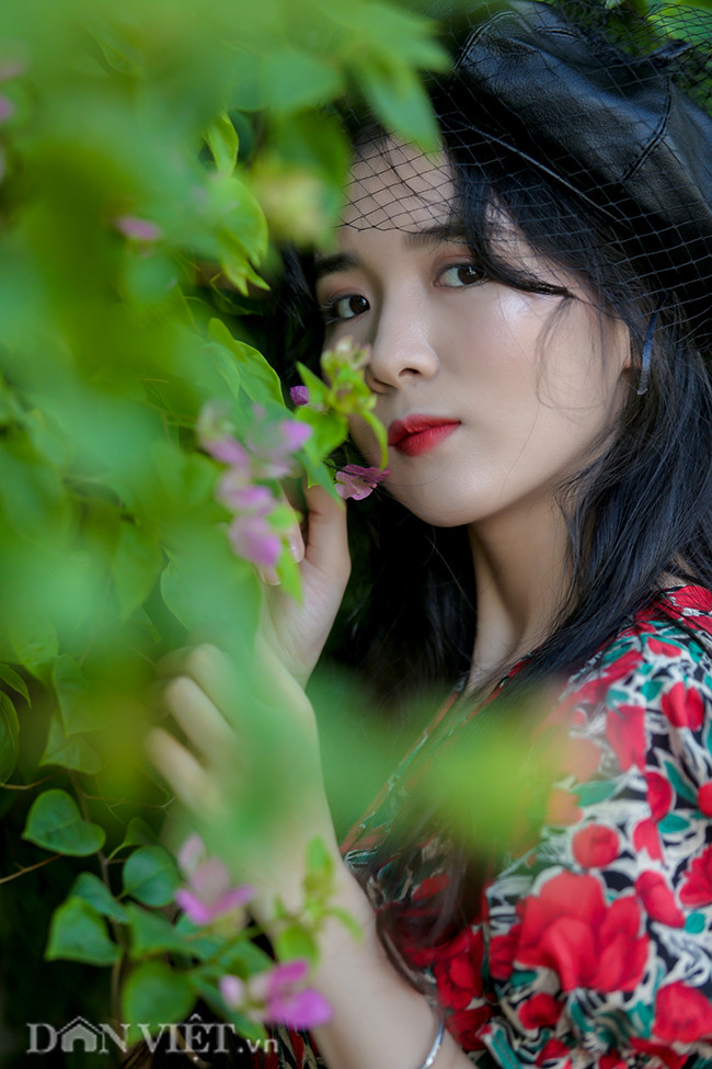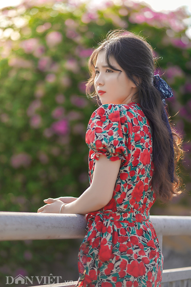 Nhiều thiếu nữ hoà mình trong nắng cùng giàn hoa giấy.