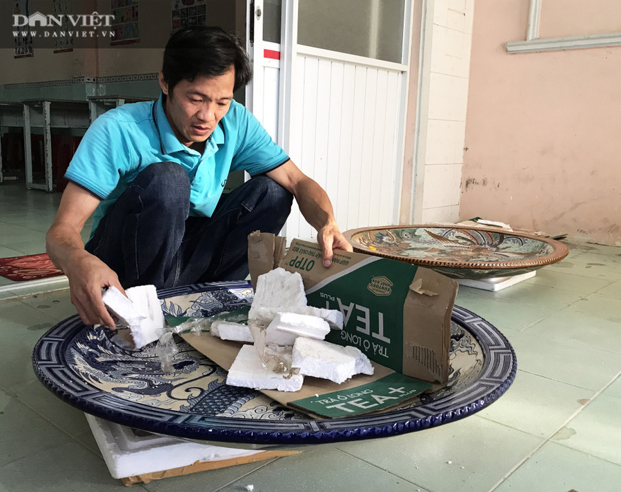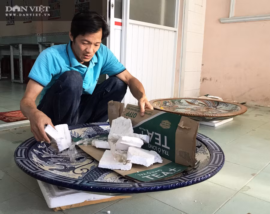 | Thầy giáo Nam đang bóc một chiếc đĩa gốm có kích thước khủng được cất giữ trong kho. Ảnh: M.A. |