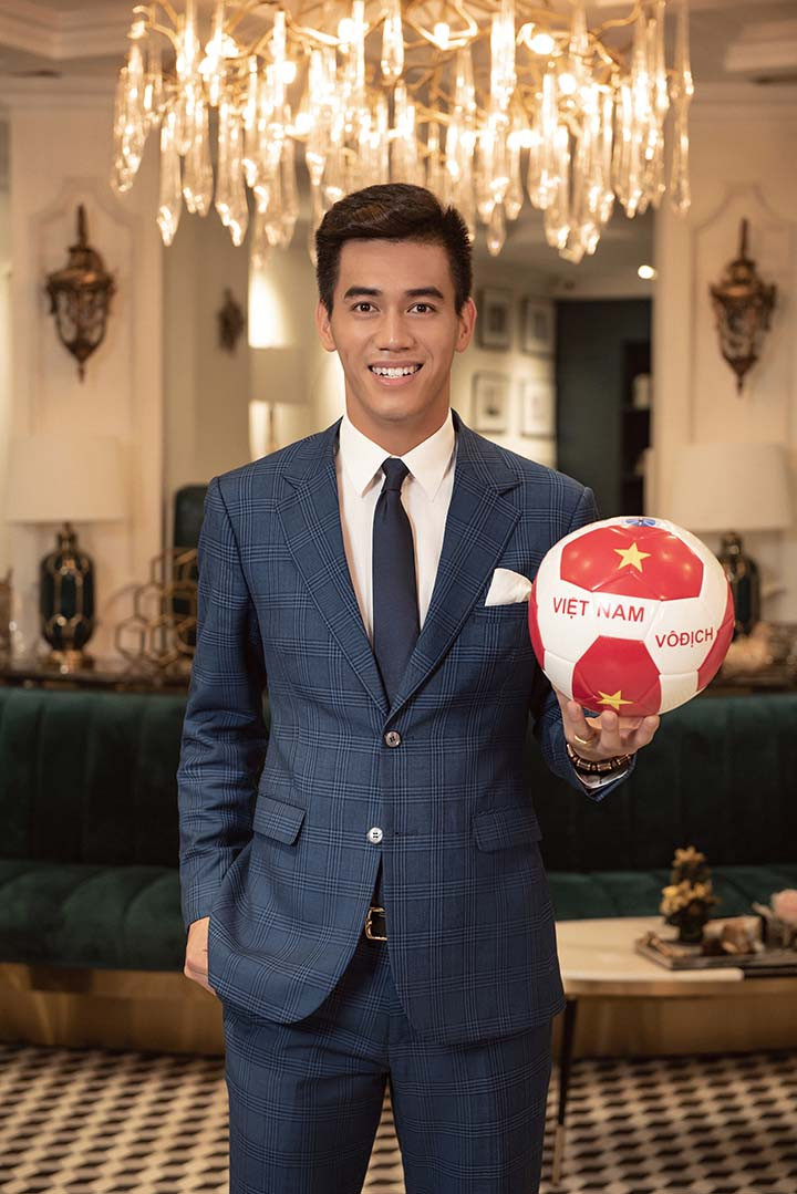 Vì lịch trình bận rộn, chàng tiền đạo đã nhờ Hoa hậu Ngọc Hân tư vấn về trang phục để có diện mạo chỉn chu, chững chạc hơn khi xuất hiện tại các buổi giao lưu với báo giới. Khoác bộ suit do Ngọc Hân chuẩn bị, Tiến Linh rất hứng thú bởi hàng ngày anh vốn quen với ‘quần đùi áo số’ hoặc trang phục thể thao thoải mái.