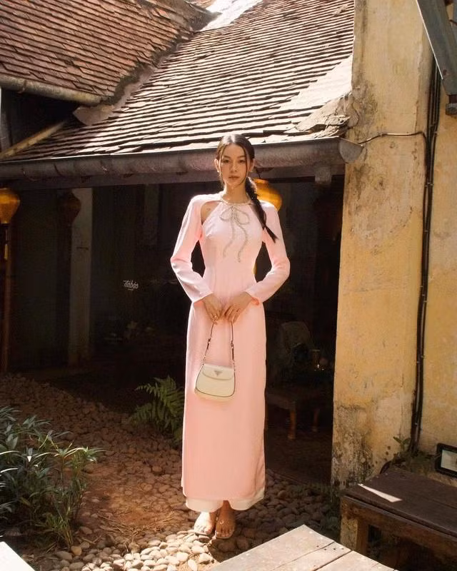 Trong bảng màu phong phú, áo dài hồng nổi lên như một biểu tượng của sự quyến rũ và đẳng cấp, đặc biệt là trong không khí ngập tràn năng lượng của dịp tết.