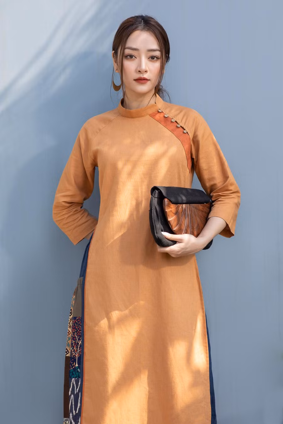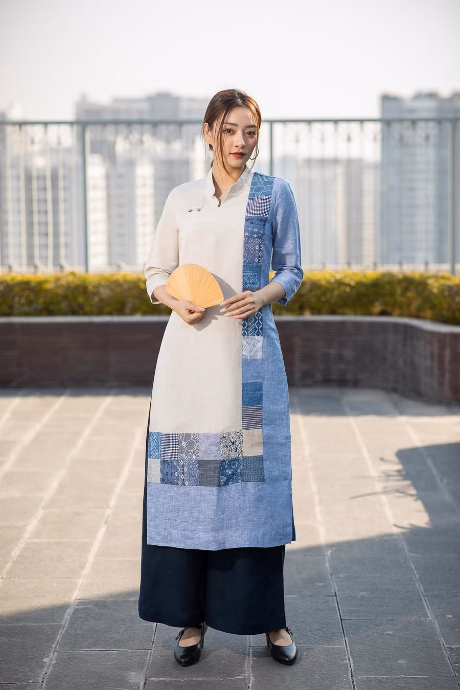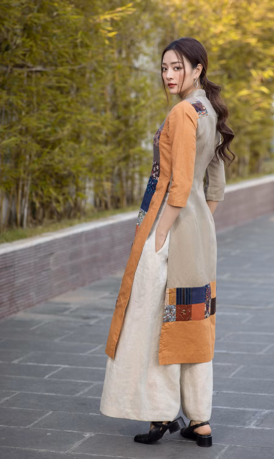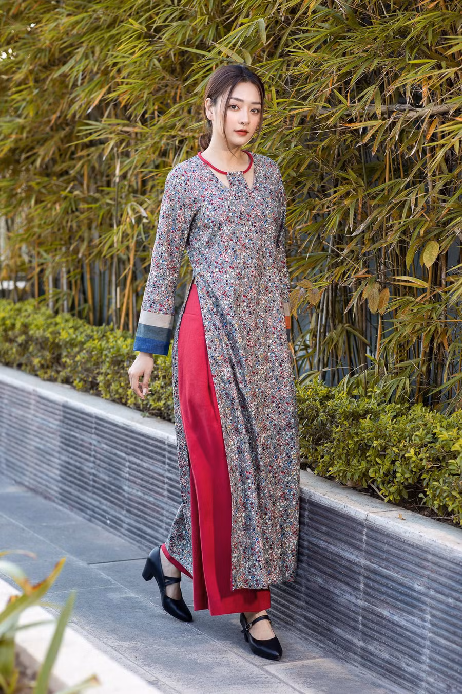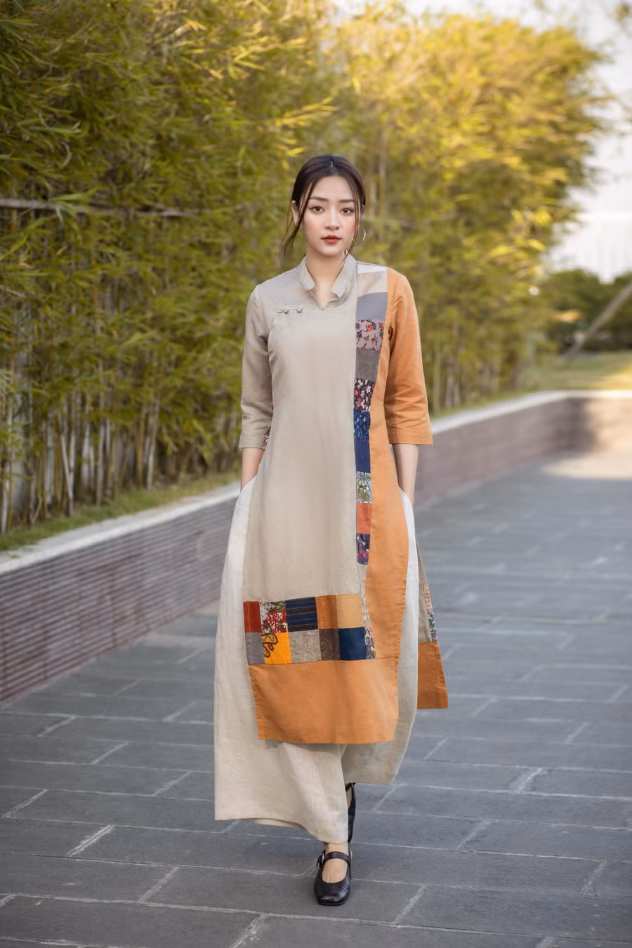 Áo dài Tết 2022 của MONO vẫn theo phong cách can chắp Mosaic mà thương hiệu theo đuổi. Mỗi mẫu áo dài là một cách ghép vải sáng tạo, độc đáo mang theo chất riêng của chính người chưng diện.