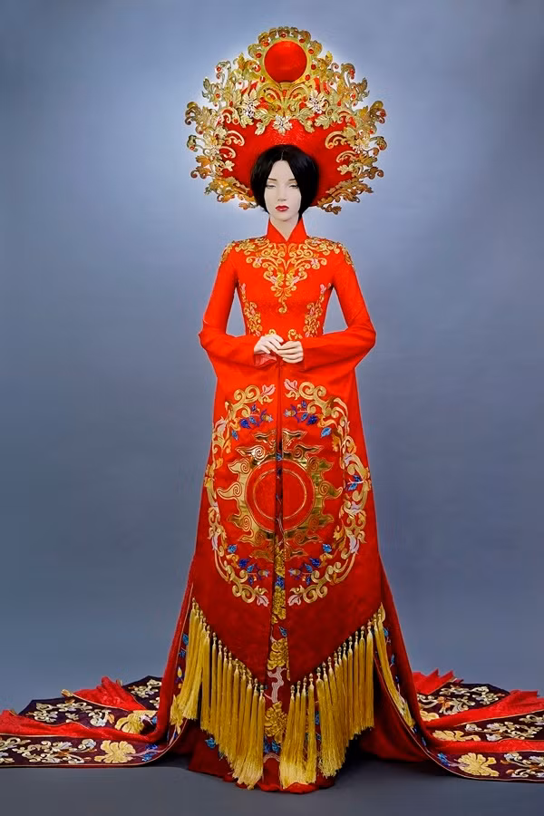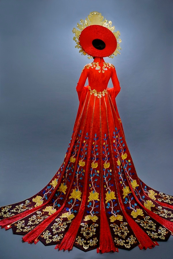 Đuôi áo được tác giả cách tân từ trang phục trong điệu múa "Lục cúng hoa đăng" của nhã nhạc cung đình Huế.