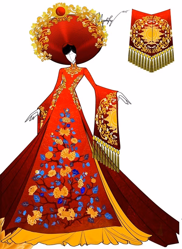 Quá trình thực hiện trang phục mất ba tháng, từ bản phác thảo, chọn chất liệu, nhuộm vải đến lên phom dáng cho áo và ráp. Nhà thiết kế cho biết hoa văn ở tay áo và trên vành mấn được lấy ý tưởng từ cổng kinh thành Huế. Khi di chuyển, Huyền My sẽ chắp hai tay khép kín tạo thành hình vầng mặt trời.