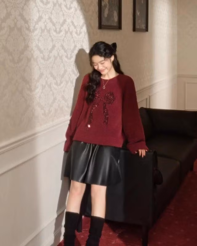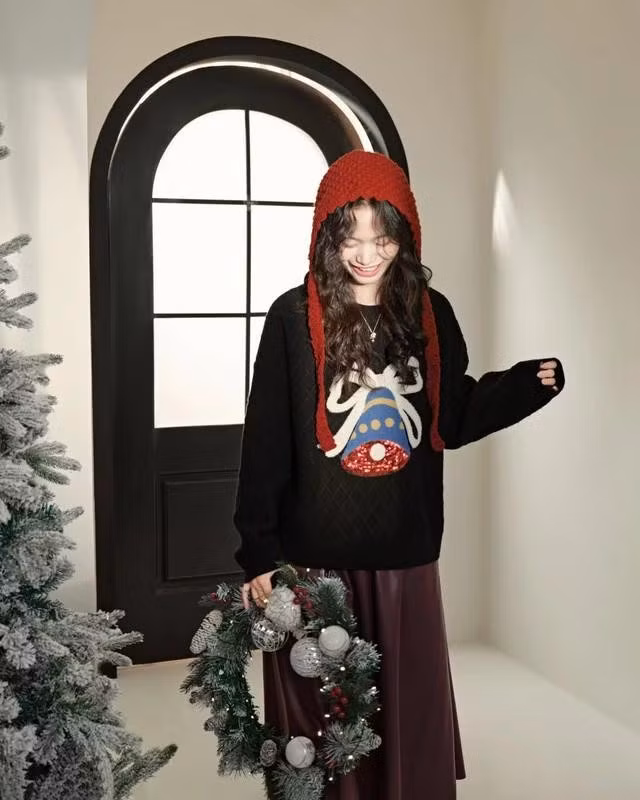 Những họa tiết như cây thông Noel, bông tuyết, chiếc chuông hay nơ đỏ luôn là lựa chọn hàng đầu mỗi dịp Giáng sinh. Những thiết kế này không chỉ gợi nhắc vẻ đẹp của mùa lễ hội mà còn dễ dàng phối cùng các món đồ như quần jeans, chân váy xòe hay bốt cao cổ.