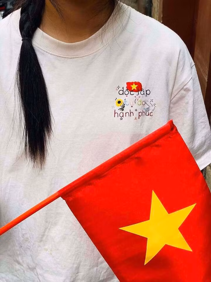 Thời trang yêu nước không chỉ dừng lại ở áo phông. Nhiều bạn trẻ đang âm thầm lan tỏa tinh thần yêu nước qua những thiết kế thời trang khác như áo dài thêu tay hoa mỹ cùng dòng tiêu ngữ thiêng liêng "Độc lập - Tự do - Hạnh phúc" và hình ảnh cờ đỏ sao vàng.