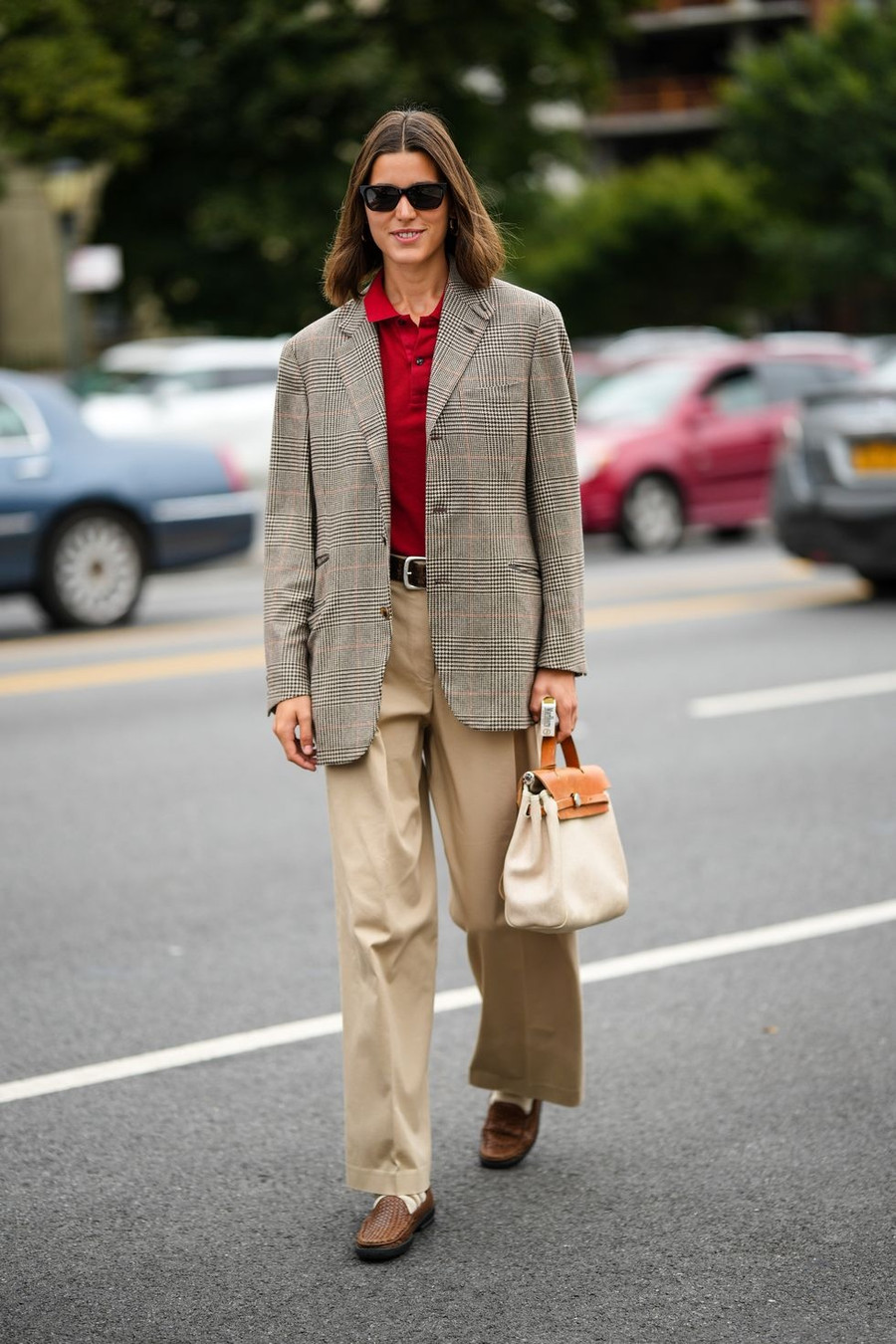 Rất thanh lịch và không thể thiếu trong phong cách công sở hằng ngày của những nữ doanh nhân là chiếc áo thun polo sáng màu. Trong khi đó, giày loafer đế bệt và quần tây được thêm vào để đem tới cho người mặc bản phối nghiêm túc, chuẩn chỉnh hơn.