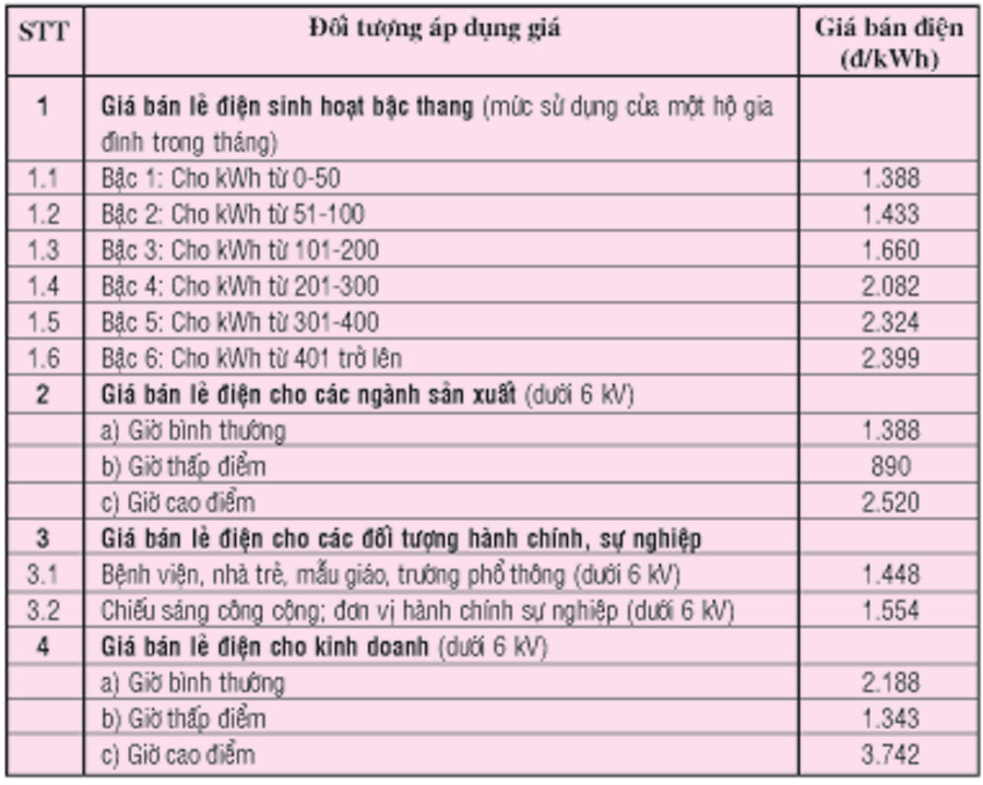 Trích biểu giá bán lẻ điện