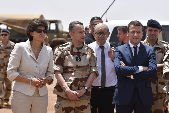 Trong ảnh, Tổng thống Pháp Macron (ngoài cùng bên phải), Ngoại trưởng Jean-Yves Le Drian (giữa) và Bộ trưởng Quốc phòng Sylvie Goulard trong chuyến thăm binh sĩ Pháp đóng quân tại Mali tháng trước. Ảnh: Reuters