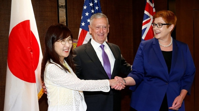 Bộ trưởng Quốc phòng Australia Marise Payne gặp mặt người đồng cấp Nhật Bản Tomomi Inada và người đồng cấp Mỹ James Mattis bên lề Diễn đàn an ninh Đối thoại Shangri-La lần thứ 16. Ảnh: Reuters
