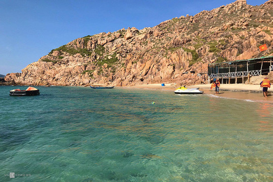 Nơi đây được lòng du khách nhờ khung cảnh thiên nhiên còn hoang sơ, biển xanh trong, những dãy đá nhấp nhô. Bạn có thể sử dụng các dịch vụ thể thao nước để trải nghiệm như đi tàu chuối, lái môtô nước, canô dù kéo... Ảnh: Vy An.