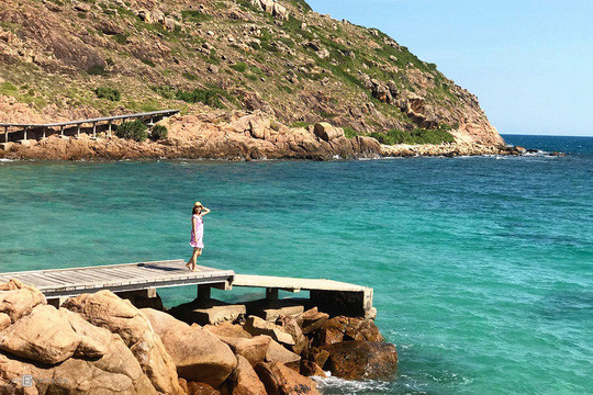 "Đặc sản" của Hòn Khô là trải nghiệm lặn ngắm san hô. Giá thuê thuyền ra đảo khoảng 200.000 - 300.000 đồng, chở 5-10 người, thời gian 10-15 phút. Bạn cũng có thể đặt tour trọn gói, các tour thường đưa khách đến Nhơn Hải, sau đó sang Hòn Khô tắm, chơi các trò thể thao nước, check-in ở cây cầu gỗ dựng trên ghềnh đá. Mỗi hành trình kéo dài khoảng 2-3 tiếng, giá từ 180.000 đồng mỗi người (không bao gồm xe đưa đến Nhơn Hải, ăn trưa). Ảnh: Vy An.