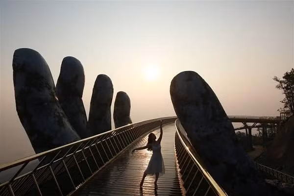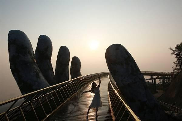 Cầu Vàng - cây cầu nhất định phải check- in - bỗng trở nên thênh thang hơn bao giờ hết. Chẳng cần phải cố gắng canh me hay chen lấn trong dòng người đông đúc mới có bức selfie tại “Top 100 điểm đến tuyệt vời nhất thế giới” (theo tạp chí TIME), Cầu Vàng lúc hoàng hôn buông sẽ là sân khấu của riêng mình bạn. Hãy thỏa sức “pause” hình theo ý muốn, hoặc chỉ cần thư thả tản bộ trên “dải lụa bồng bềnh giữa mây trời” này trong ráng chiều buông, cũng đủ thấy mình được sở hữu cả thế giới rồi…