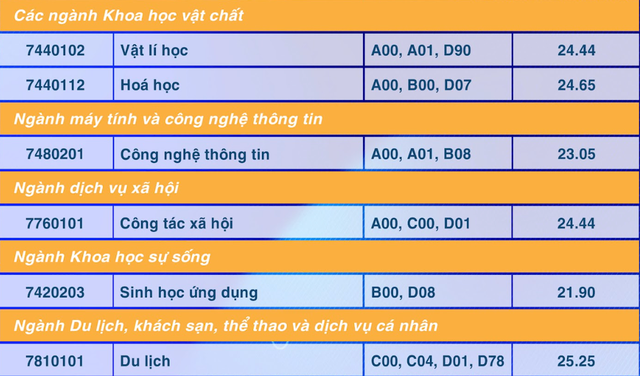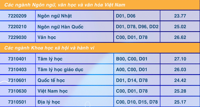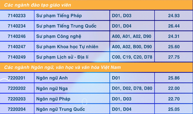 Cụ thể, 3 ngành đào tạo thuộc nhóm ngành khoa học xã hội (KHXH) của trường có điểm chuẩn trên 28 điểm. Dẫn đầu về điểm chuẩn là hai ngành sư phạm ngữ văn và sư phạm lịch sử với mức điểm 28,6 điểm; cũng ở mốc trên 28 điểm còn có sư phạm địa lý với 28,37 điểm.