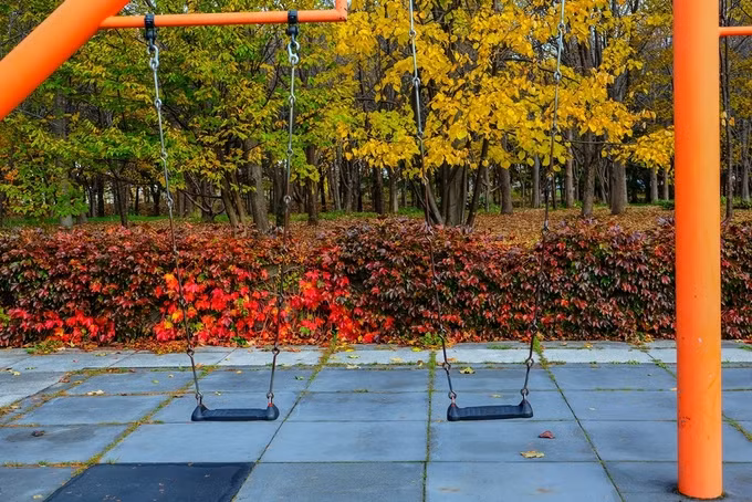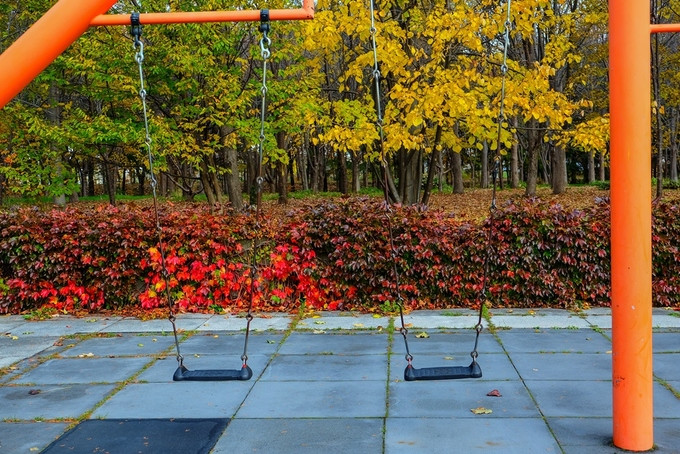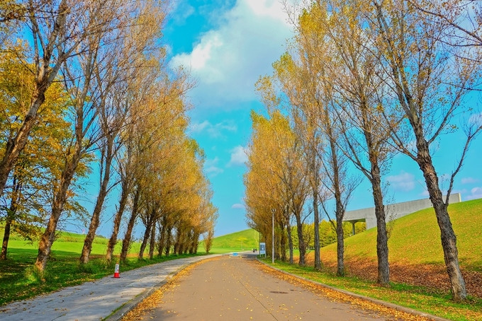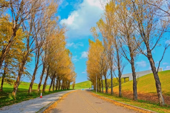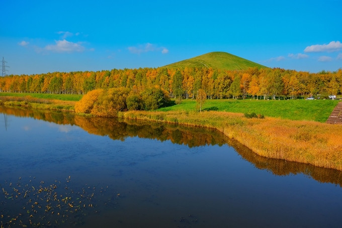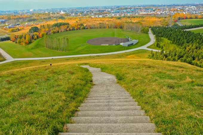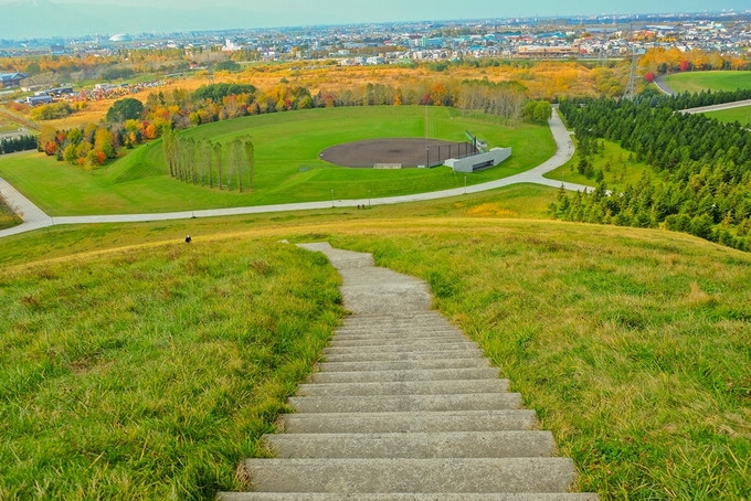 Leo lên đỉnh đồi của công viên Moerenuma Park ở Sapporo, du khách được ngắm nhìn trọn vẹn ba sắc màu của mùa thu.