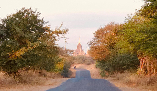 Đến đây, có lẽ trải nghiệm thú vị nhất là ngắm thành phố hiện ra trong làn sương hồng mỗi buổi bình minh. Tôi có 3 buổi sáng ngắm bình minh Bagan ở 3 nơi khác nhau: Con đường dài mờ hơi sương ngày mới đến, đỉnh tháp Shwesandaw và trên một ngọn đồi.