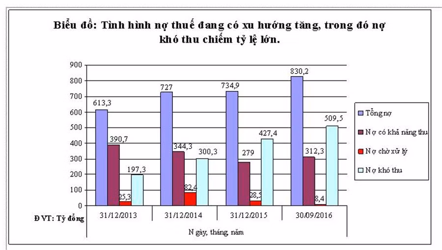 Hiện nay, việc nợ thuế chỉ xử lý hành chính thông qua các biện pháp cưỡng chế theo quy trình, không thuộc hành vi vi phạm hình sự, do đó khi chuyển hồ sơ để phối hợp giải quyết với cơ quan công an thì cũng chỉ là biện pháp động viên, thuyết phục DN thực hiện nên thu nợ cũng không khả quan. Rõ ràng, trước tình hình nợ có xu hướng tăng, việc tìm ra hướng giải quyết hợp lý khoản nợ lớn như nợ khó thu (509,5 tỷ đồng/830,2 tỷ đồng tổng nợ), phấn đấu giảm nợ thuế xuống dưới mức 5% như chỉ tiêu giao là vấn đề nan giải.