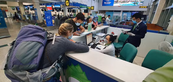 Hành khách nước ngoài liên hệ quầy đại diện Hãng Bamboo Airways tại Tân Sơn Nhất - Ảnh: CÔNG TRUNG