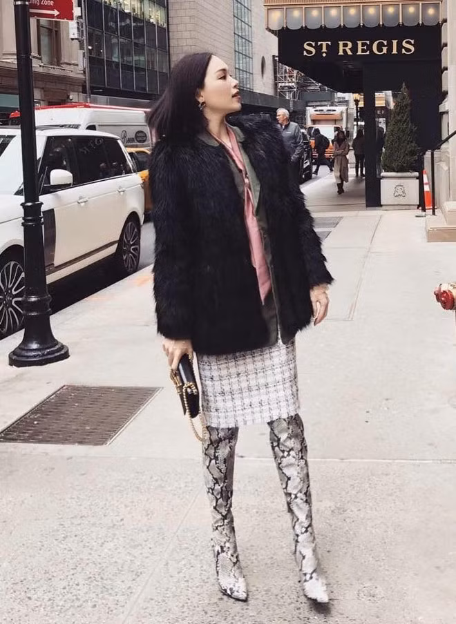 Linh Rin ưa chuộng phong cách ăn mặc trưởng thành, sang chảnh. Mỗi bộ đồ đều được cô mix rất chỉn chu, đầy đủ phụ kiện. Ở hình trái, 9X trông sành điệu khi phối áo khoác lông, váy chữ A kẻ cùng đôi boots họa tiết da rắn dài quá đầu gối. Trong hình phải, Linh Rin lại toát lên khí chất dịu dàng, sang trọng của một nàng tiểu thư với chiếc váy tay bồng thanh lịch.