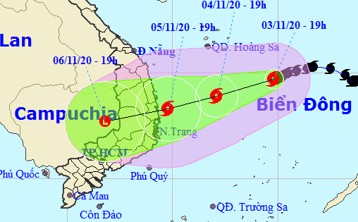 Dự báo trong 24 giờ tới, bão số 10 di chuyển theo hướng Tây Tây Nam, mỗi giờ đi được 10-15 km. Đến 19 giờ ngày 4-11, vị trí tâm bão ở khoảng 13,9 độ Vĩ Bắc; 112,1 độ Kinh Đông, cách Quảng Ngãi đến Khánh Hòa khoảng 290 km về phía Đông. Sức gió mạnh nhất vùng gần tâm bão mạnh cấp 8-9 (60-90 km/giờ), giật cấp 11.