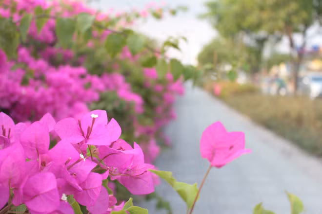 Lân la khắp nẻo đường Q.7, TP.HCM trong một buổi chiều, chúng tôi bắt gặp hình ảnh giàn hoa giấy nở rộ sắc màu đỏ, hồng, trắng trải dài gần 500 m bên lề đường Nguyễn Hữu Thọ ngay trước cổng Trường ĐH Tôn Đức Thắng (Q.7, TP.HCM). Những tia nắng chiều chiếu vào những chùm hoa giấy làm chúng trở nên đẹp hơn.