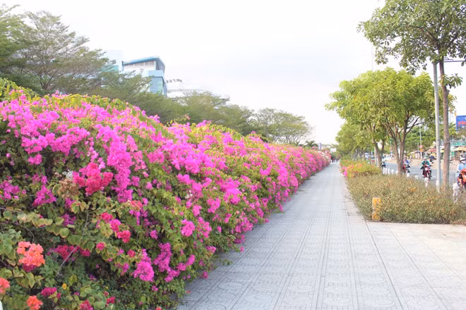 Chị Nguyễn Thị Xuân Trang, 30 tuổi, ngụ tại đường Nguyễn Hữu Thọ, cho biết đến mùa này là hoa giấy nở nhiều. Năm ngoái sinh viên ra chụp hình nhiều lắm, nhưng nay có dịch bệnh Covid-19 nên hơi vắng.