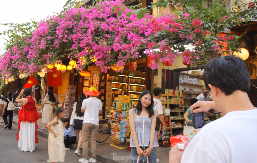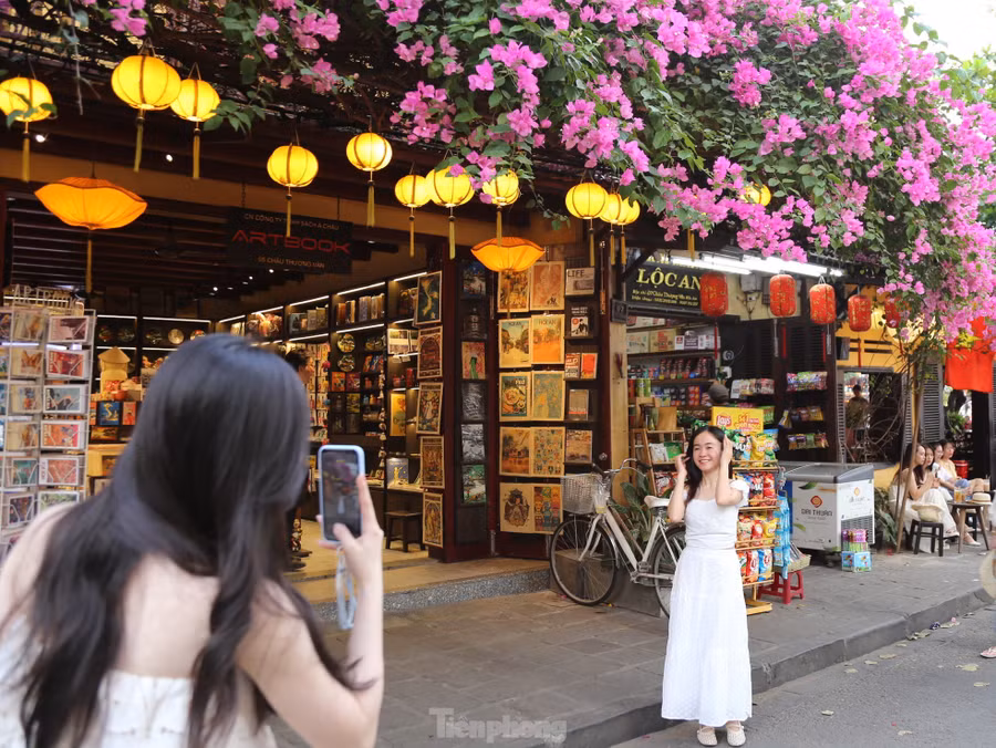 Chớm hè, những giàn hoa giấy trổ rực rỡ bên nếp nhà cổ phố Hội khiến giới trẻ mê mẩn, xếp hàng check in.