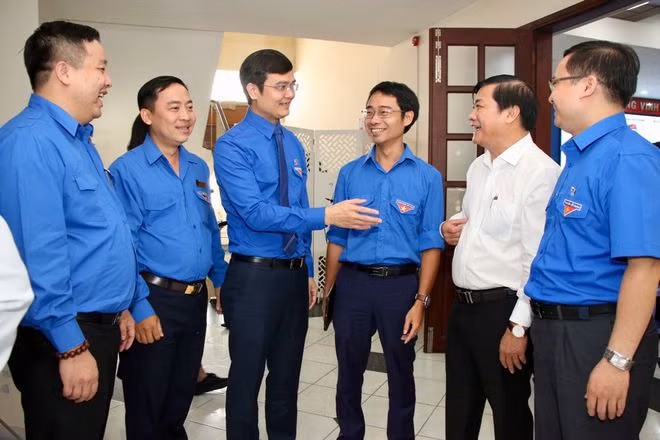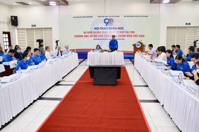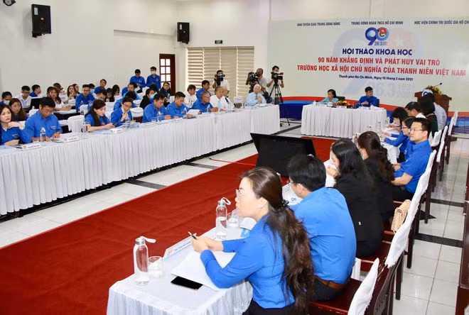 | Đồng chí Bùi Quang Huy, Bí thư thường trực T.Ư Đoàn và đồng chí Phạm Phương Thảo, nguyên Bí thư T.Ư Đoàn chủ trì hội thảo tại đầu cầu TP.HCM - ẢNH: KHẢ HÒA |