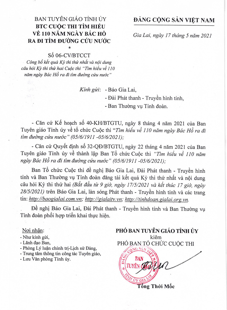 (GLO)- Ban Tuyên giáo Tỉnh ủy Gia Lai vừa có Công văn số 06-CV/BTCCT về việc công bố kết quả Kỳ thi thứ nhất Cuộc thi "Tìm hiểu về 110 năm Ngày Bác Hồ ra đi tìm đường cứu nước" (5/6/1911-5/6/2021).