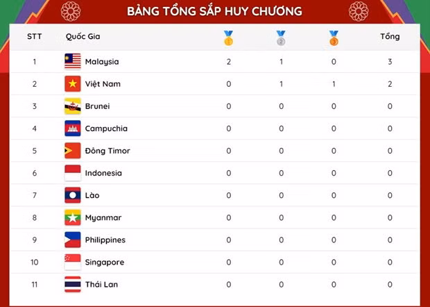 Trong ngày 8/5, đoàn thể thao Malaysia giành được 2 huy chương Vàng và 1 huy chương Bạc để xếp đầu bảng tổng sắp huy chương SEA Games 31, trong khi Việt Nam có 1 huy chương Bạc và 1 huy chương Đồng.