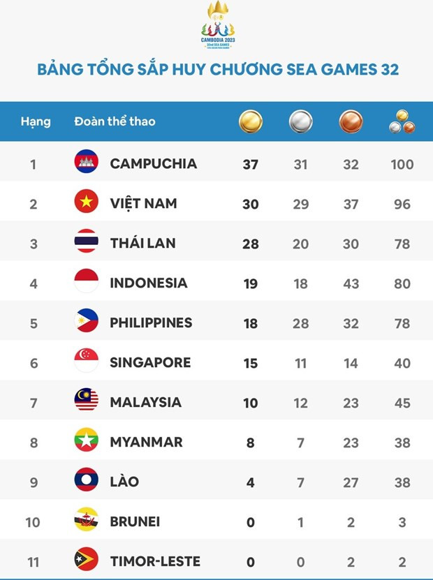 Đoàn Việt Nam hiện chỉ còn kém Đoàn chủ nhà Campuchia 7 huy chương Vàng (Campuchia có 37 huy chương Vàng, 31 huy chương Bạc và 32 huy chương Đồng).