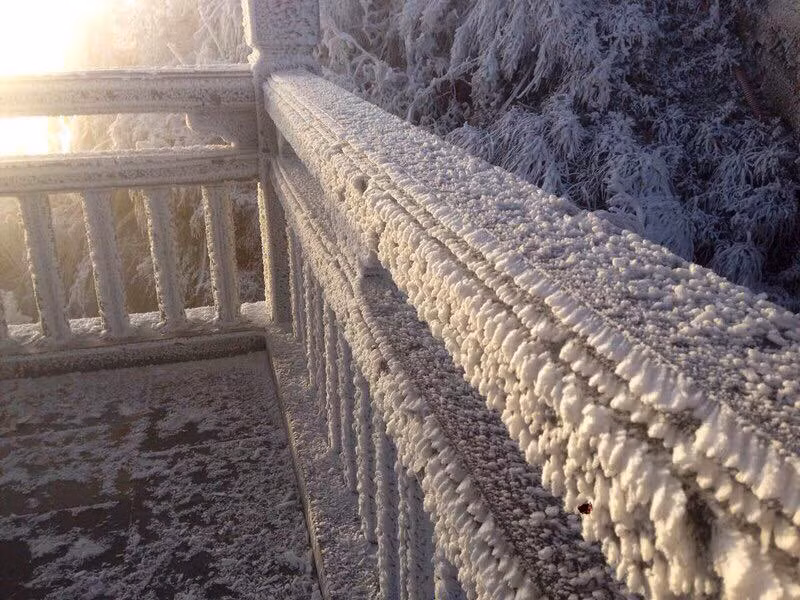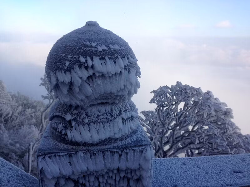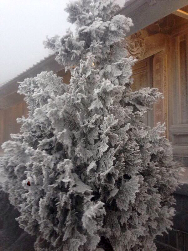 Sáng sớm nay, nhiệt độ đỉnh núi Fansipan (Lào Cai) đã xuống dưới 1 độ C, nước đọng trên cây cối, nhà cửa đóng thành băng.
