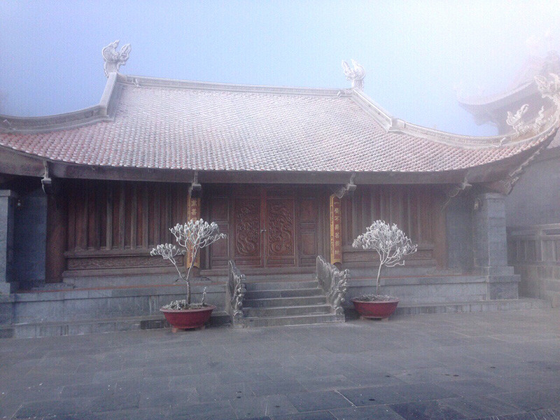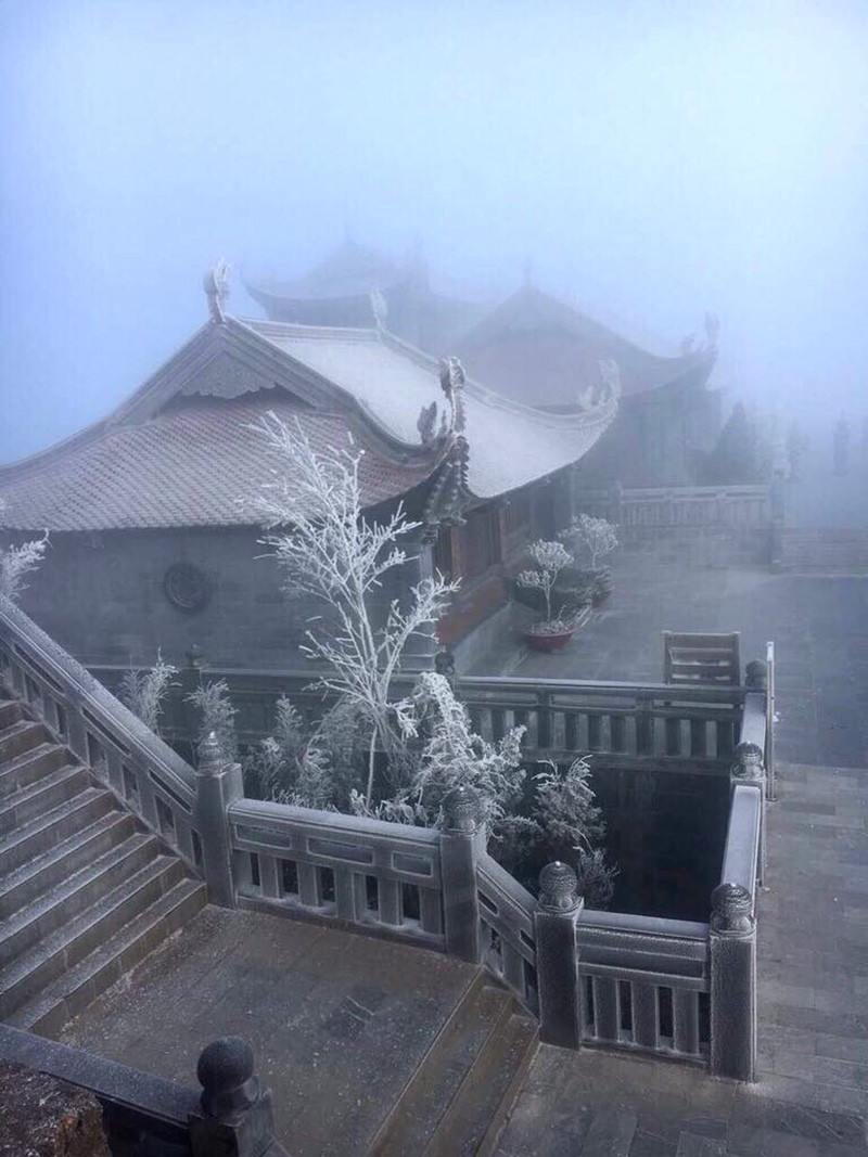 | Gác chuông và ngôi chùa trên đỉnh núi bị phủ một màu trắng xóa |